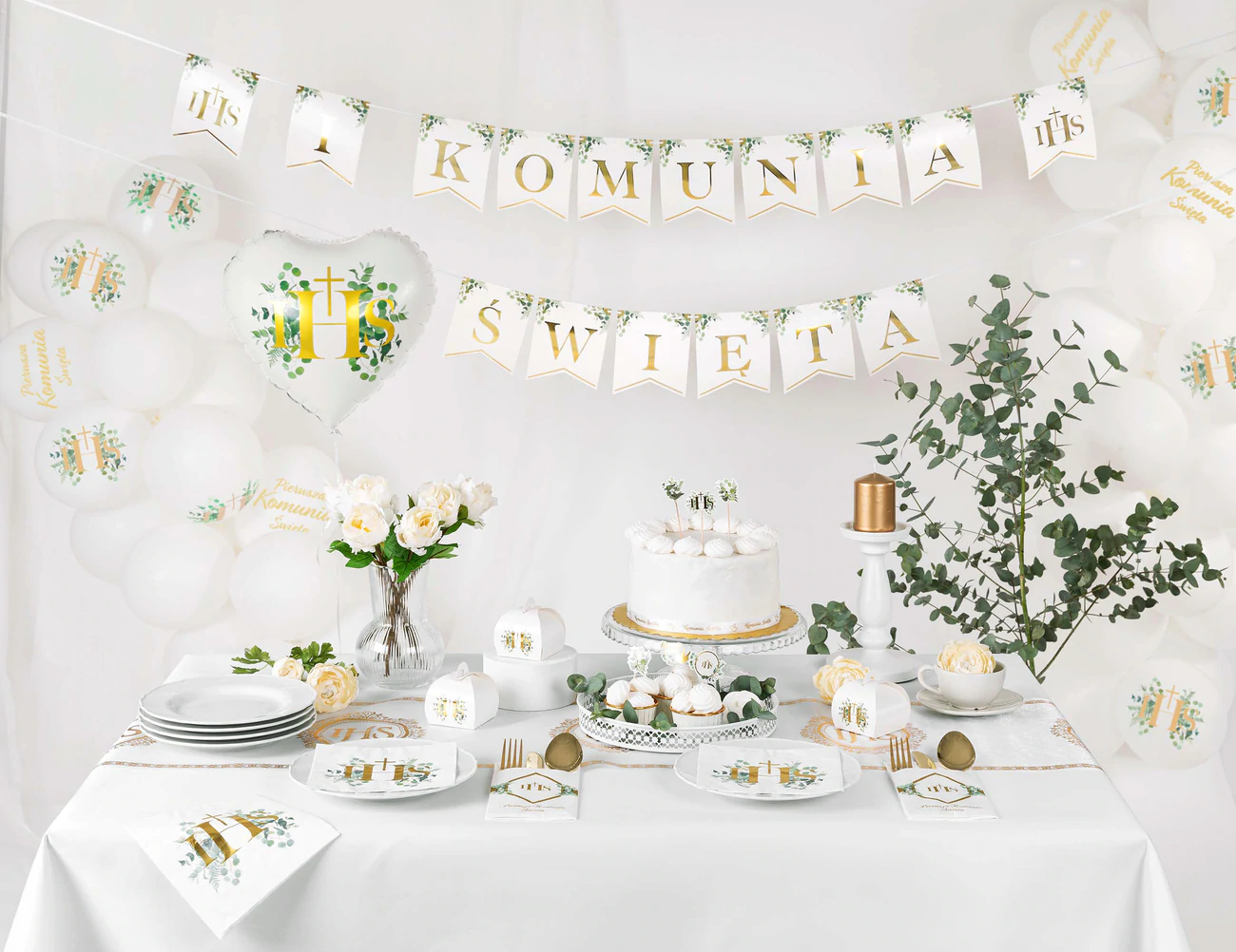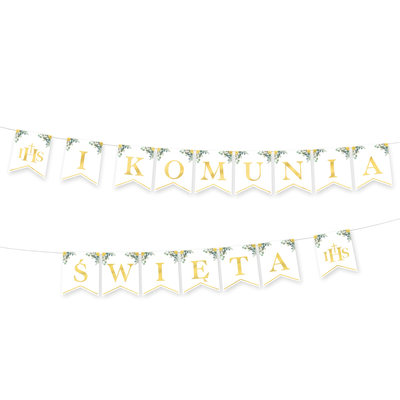 Baner komunijny o długości 240 cm to stylowa dekoracja, która doda uroczystości Pierwszej Komunii Świętej wyjątkowego charakteru. Składa się z 16 papierowych flag z literami tworzącymi napis „I Komunia Święta”, ozdobionych delikatnymi motywami eukaliptusa oraz złotymi akcentami.