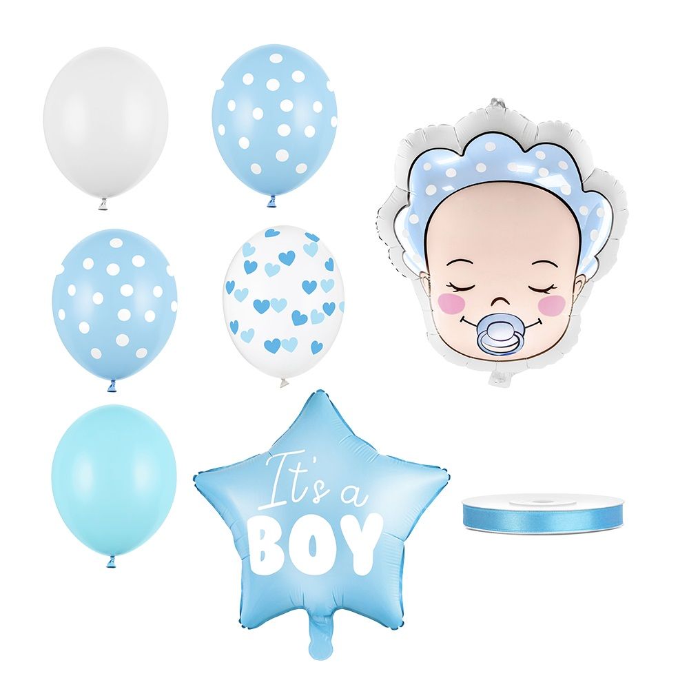 Bukiet z balonów bobas chłopiec utrzymany jest w pastelowo niebieskiej kolorystyce, co idealnie nawiązuje do płci nowego członka rodziny. 5 balonów jest w biało-niebieskie wzory, jest także gwiazdka z białym napisem "It's a boy". Furorę zrobi jednak balon z motywem główki chłopca.