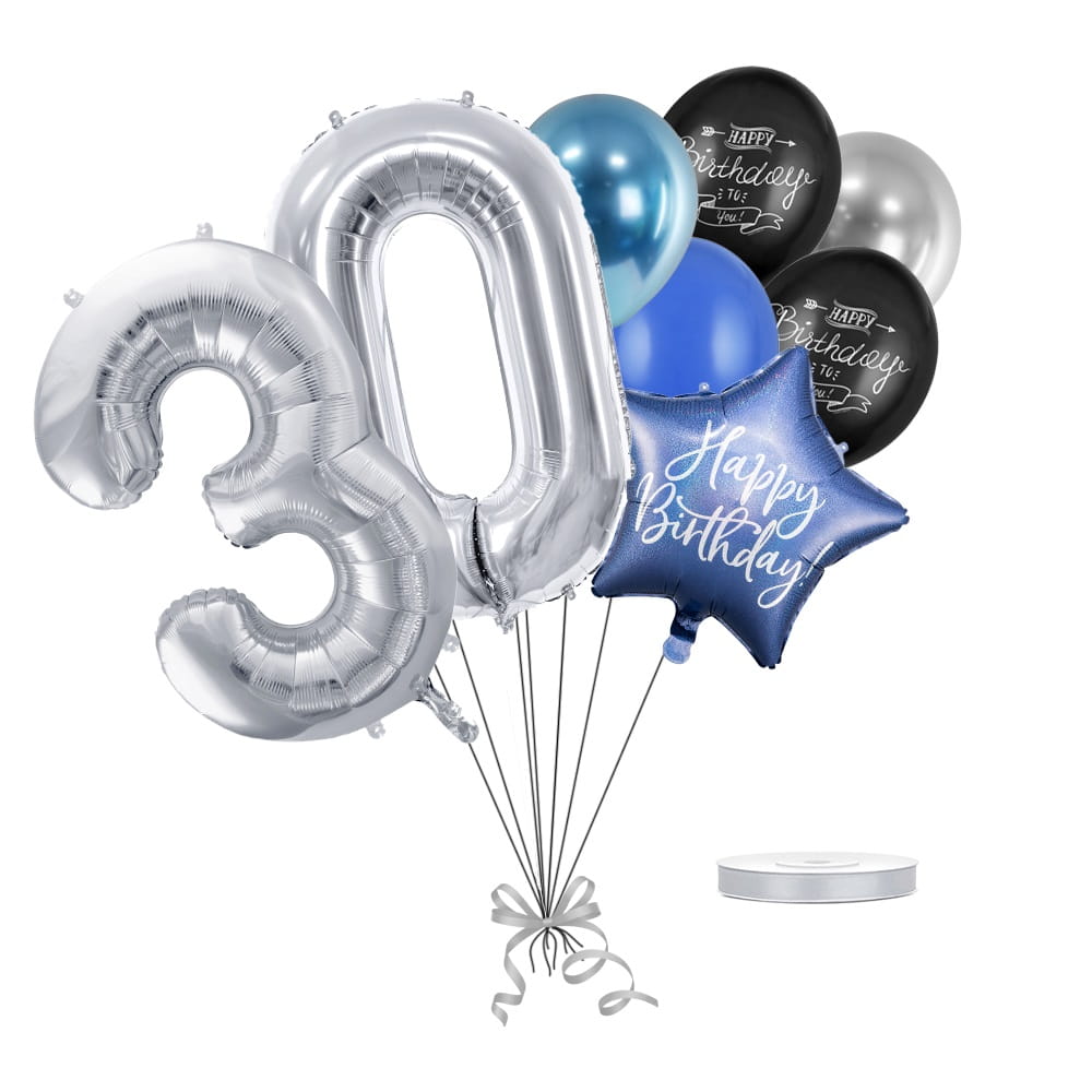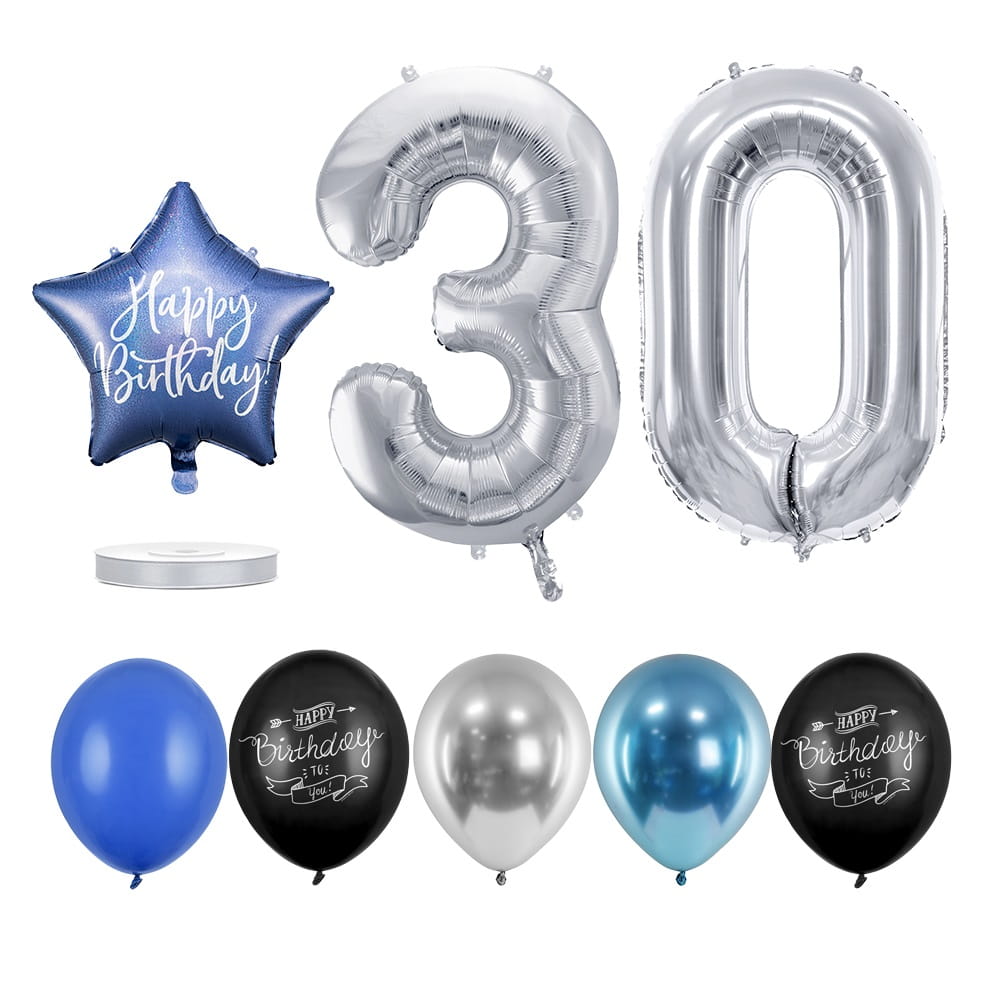 Bukiet z balonów na 30 urodziny srebrny wykonany jest w chłodnej, błyszczącej kolorystyce. Zestaw składa się z klasycznych balonów, gwiazdki, a także wielkich cyfer 3 i 0. Taki balonowy bukiet fantastycznie udekoruje każde wnętrze i posłuży jako oryginalne tło do pamiątkowych zdjęć.