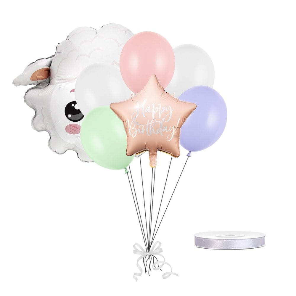 Balonowy zestaw składa się z 7 "części". Zawiera 5 klasycznych balonów, różowo-złotą, metaliczną gwiazdkę z białym napisem "Happy Birthday!", a także wisienkę na torcie - białą dmuchaną owieczkę! Bukiet z balonów będzie stanowić rewelacyjne tło do pamiątkowych zdjęć z przyjęcia urodzinowego.