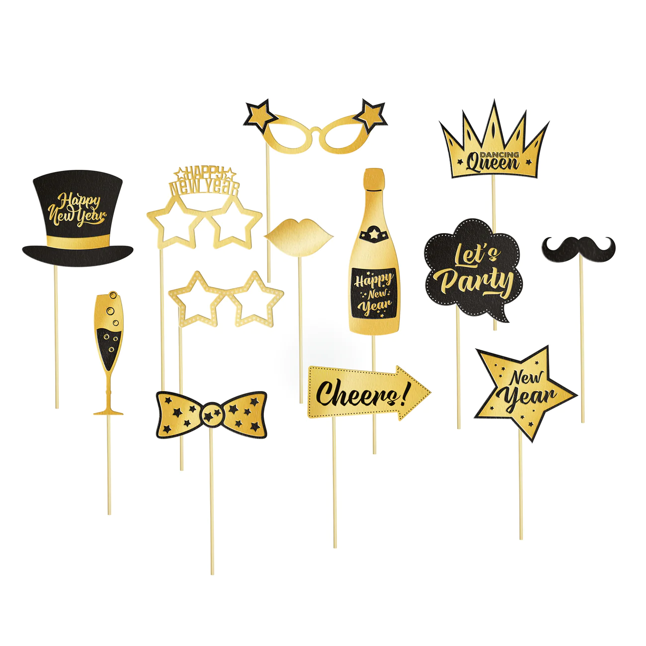Rekwizyty do zdjęć na zabawę sylwestrową w kolorach czarnym i złotym.