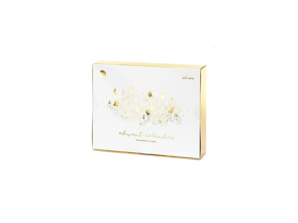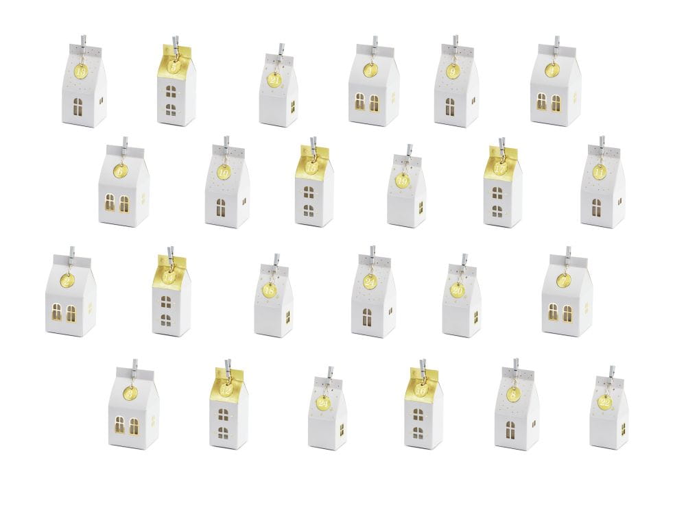 - 24 papierowe domki w kolorze białym ze złotym nadrukiem