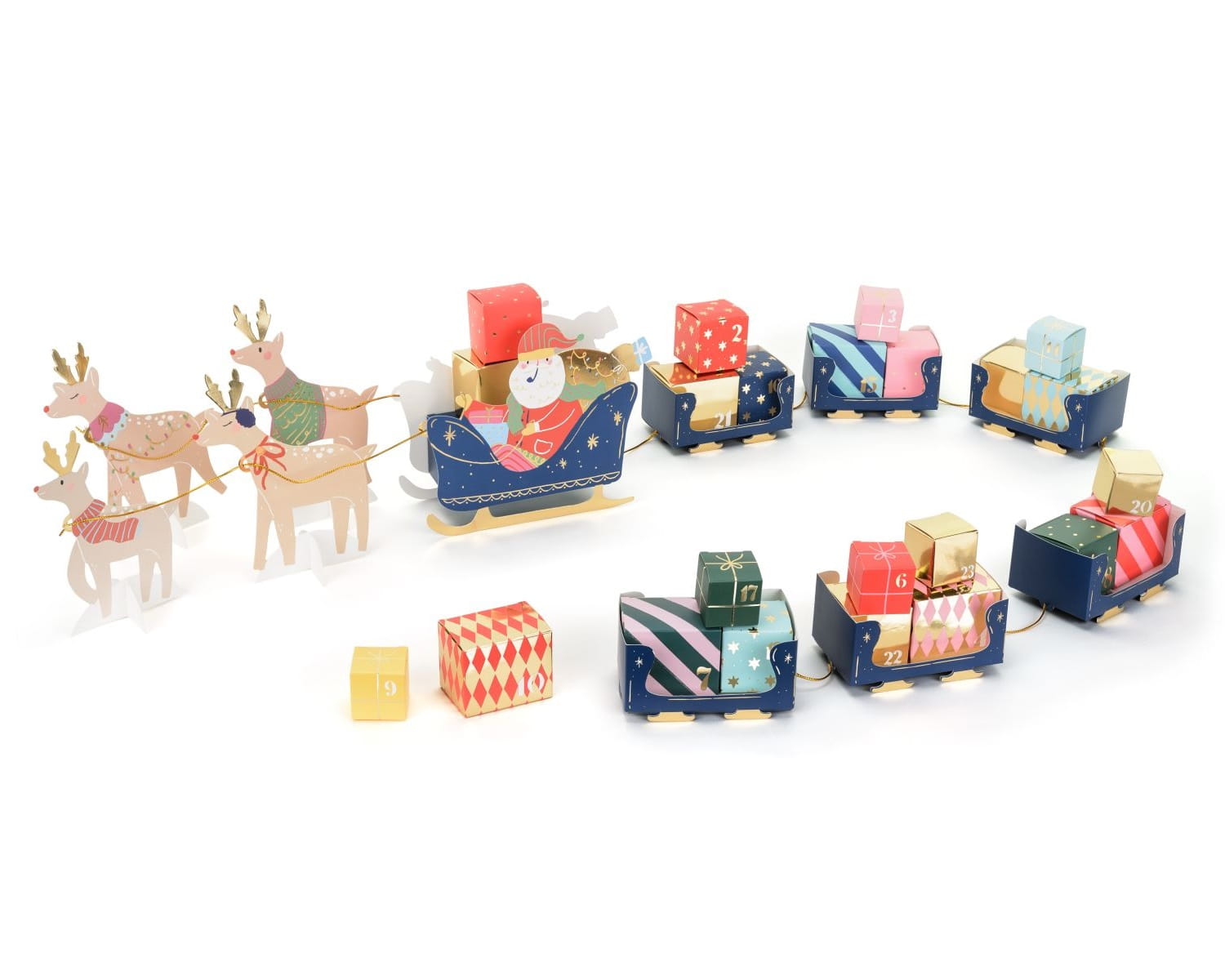 Kalendarz adwentowy zaprzęg Świętego Mikołaja z pewnością szczególnie spodoba się dzieciom, które ucieszą się że Mikołaj przywiózł im prezenty na saniach ciągniętych przez renifery! W zestawie znajdują się wszystkie niezbędne elementy, potrzebne do samodzielnego złożenia kolorowego świątecznego zaprzęgu Na każdym z pudełeczek jest liczba, odpowiadająca kolejnym dniom grudnia.