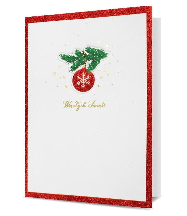 Wykonano ją z wysokiej jakości papieru z przestrzennymi aplikacjami, połyskującym brokatem i czerwoną ramką.