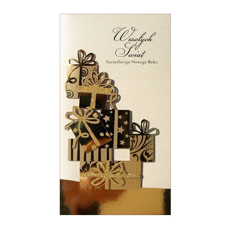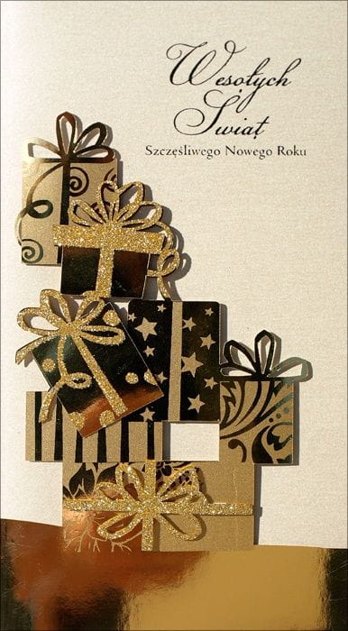 Oferowana kartka Bożonarodzeniowa jest bardzo elegancka i bogato zdobiona.