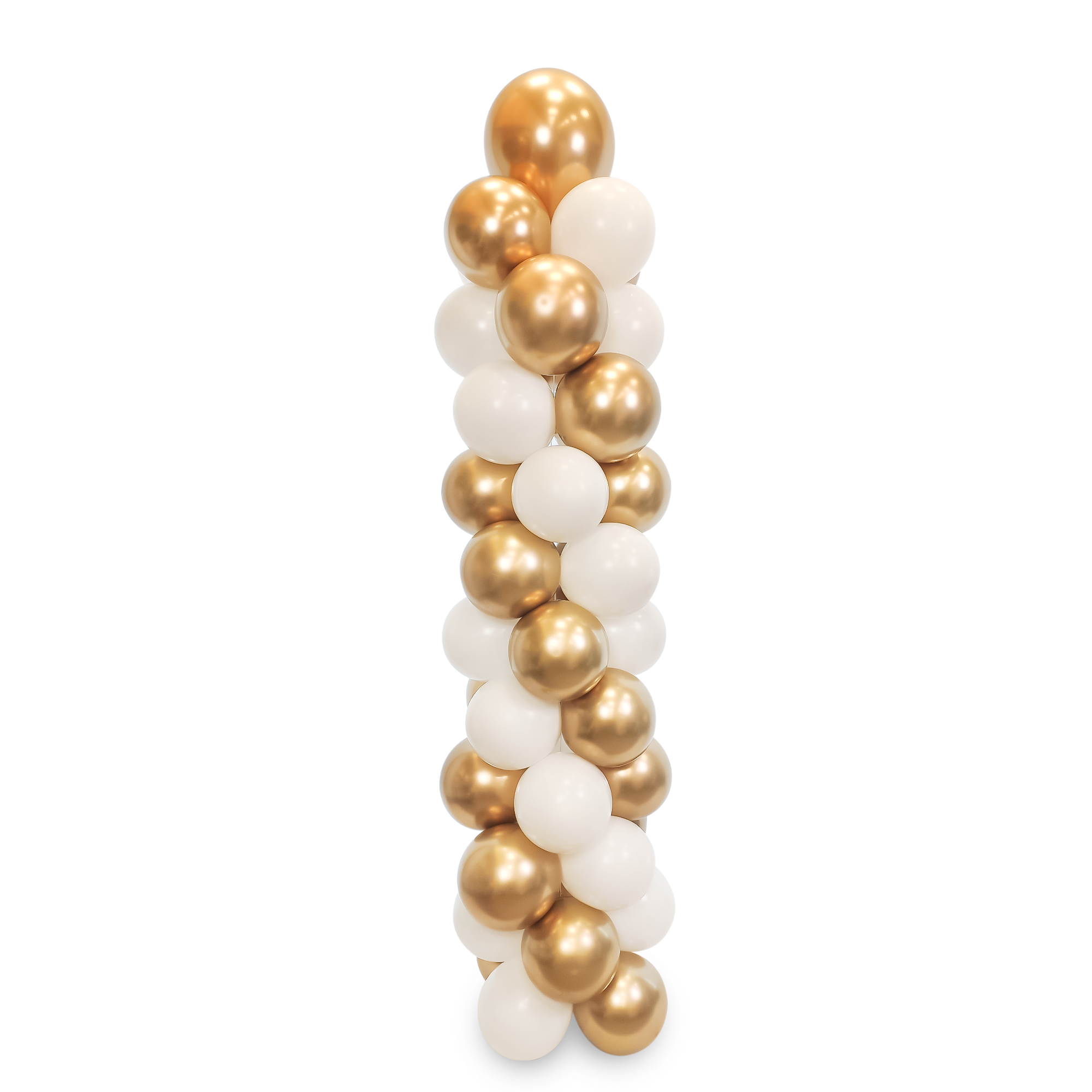 Kolumna wykonana z balonów lateksowych w kolorze białym pastelowym i złotym chromowanym.