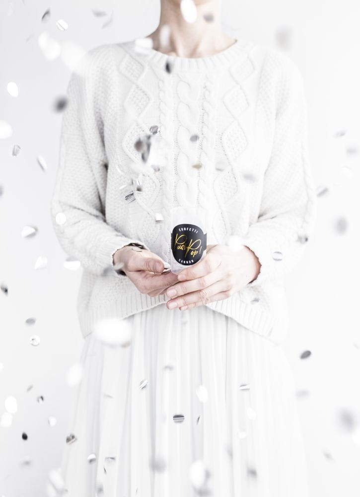 Wystrzałowe wciskane konfetti push pop w kolorze srebrnym.