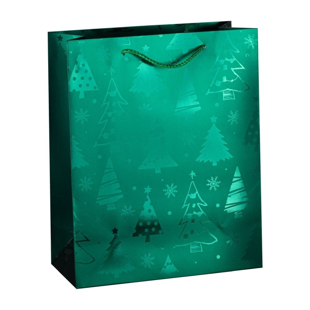Torebka świąteczna w kolorze zielonym, z nadrukiem w choinki.