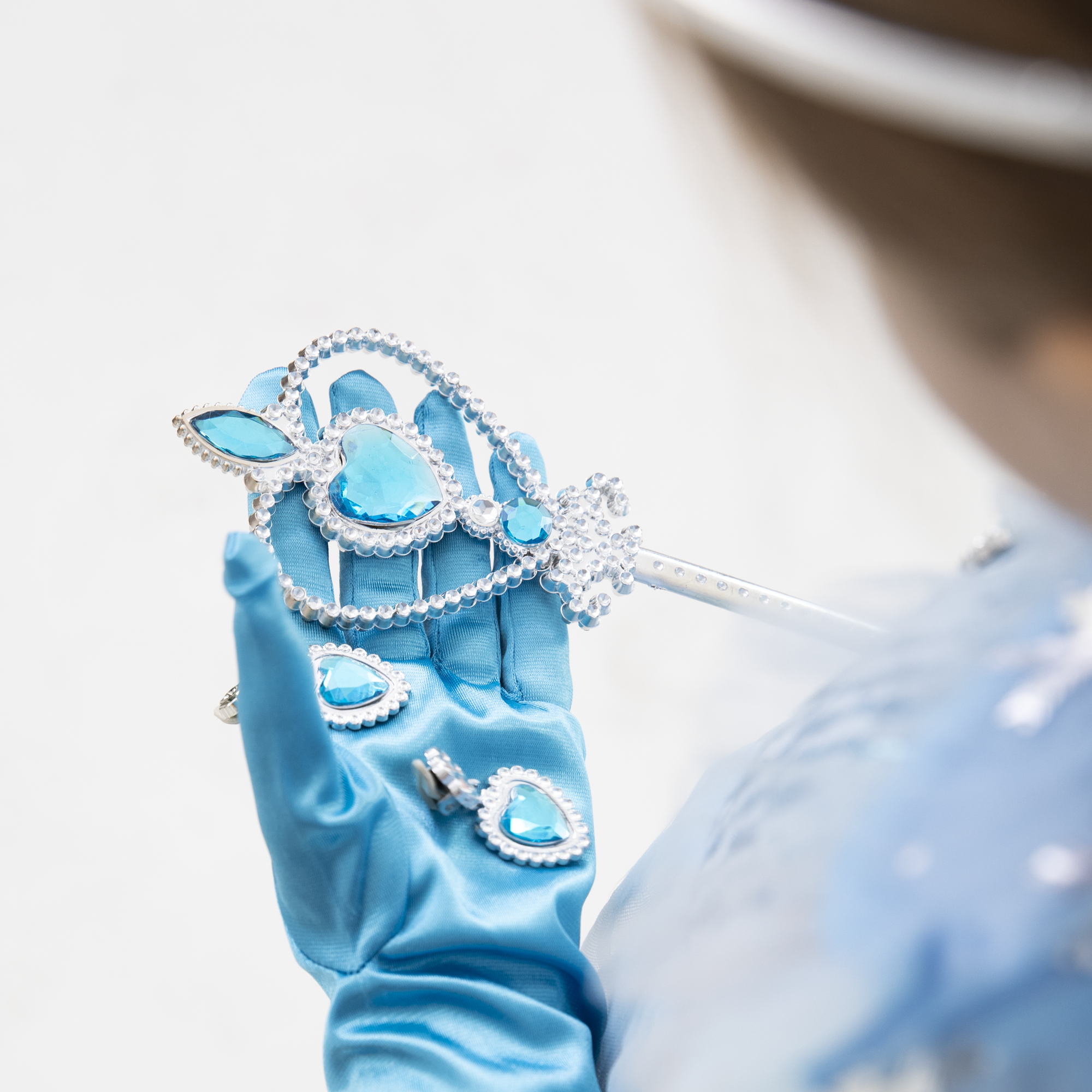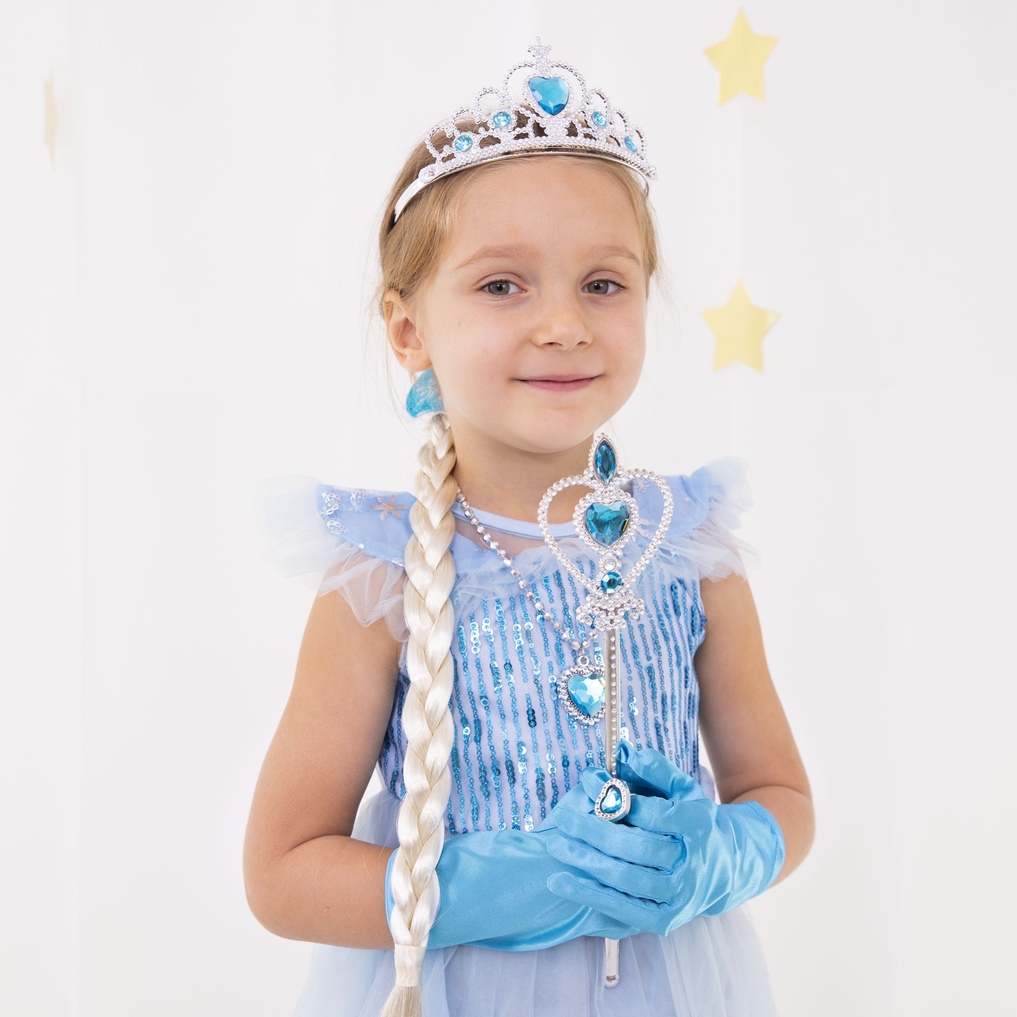 W zestawie: opaska na głowę - diadem, różdżka, naszyjnik, pierścionek, klipsy 2szt., warkocz przypinany za pomocą gumki i krokodylka, niebieskie rękawiczki 2szt.
