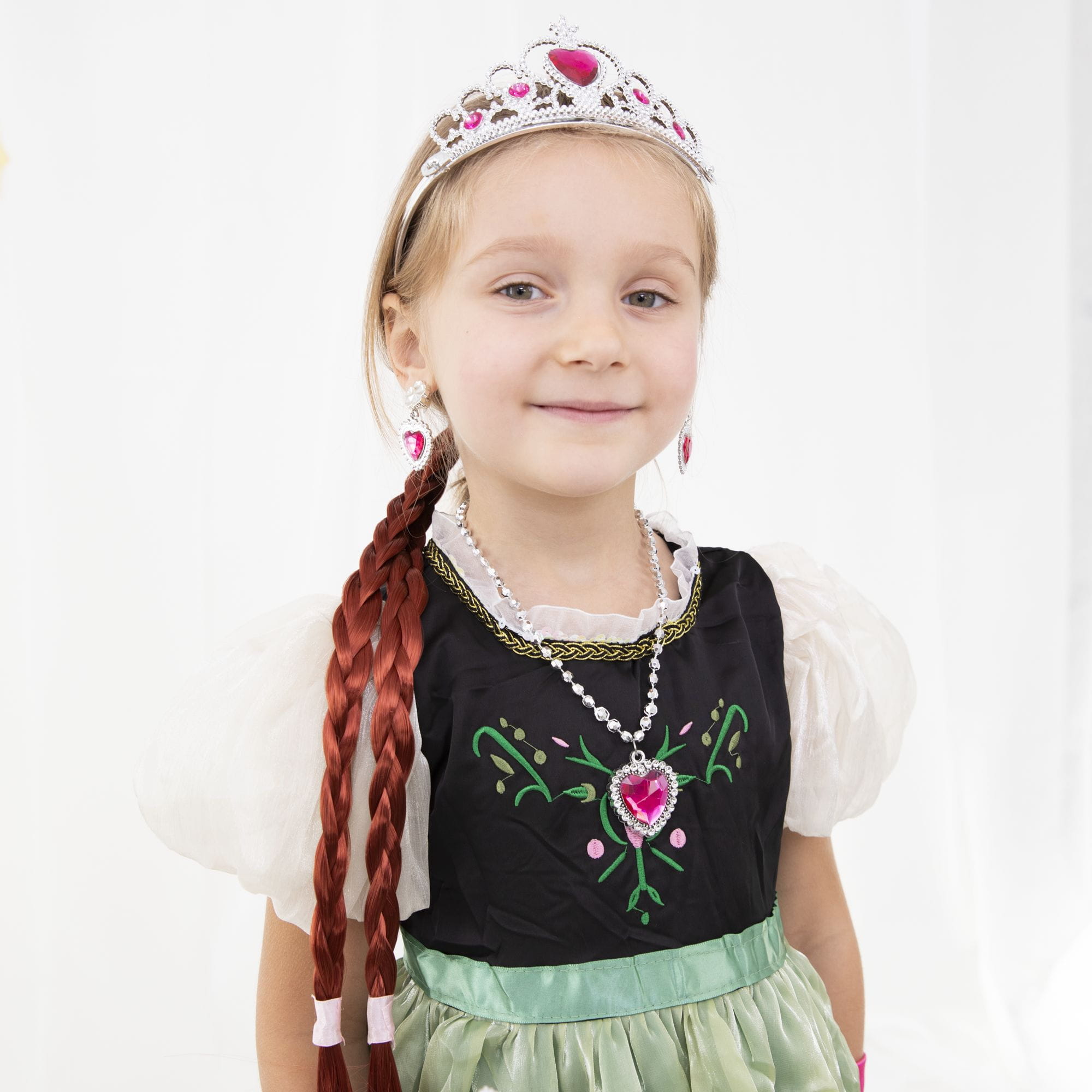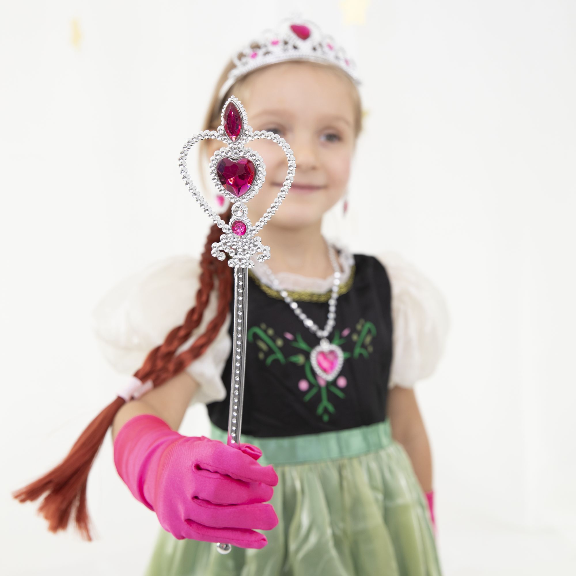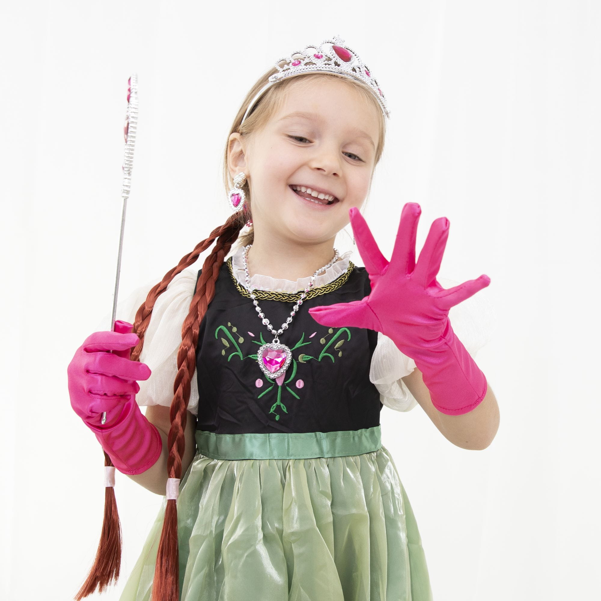 W zestawie: opaska na głowę - diadem, różdżka, naszyjnik, klipsy 2szt., brązowe warkocze przypinane za pomocą krokodylka, różowe rękawiczki 2szt.