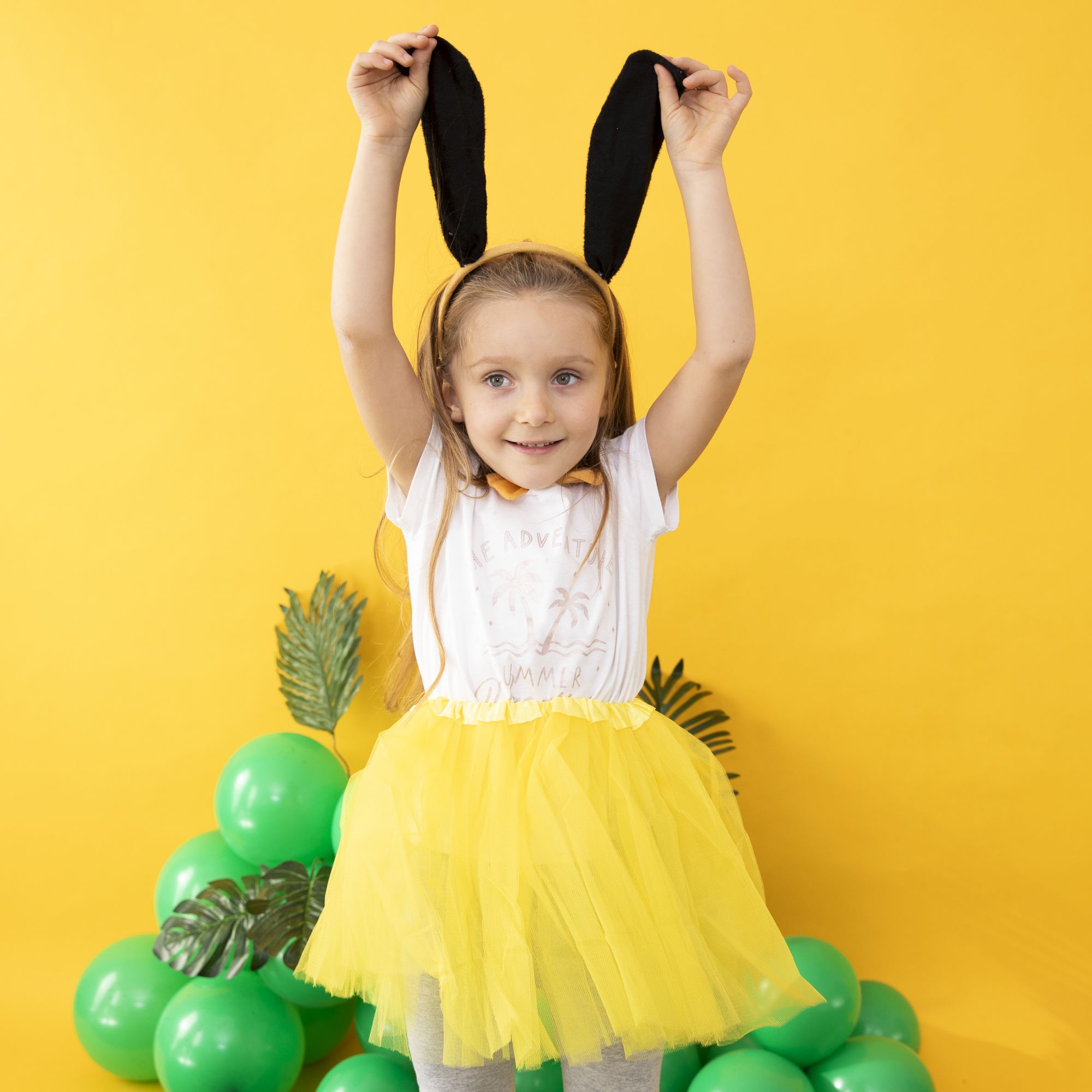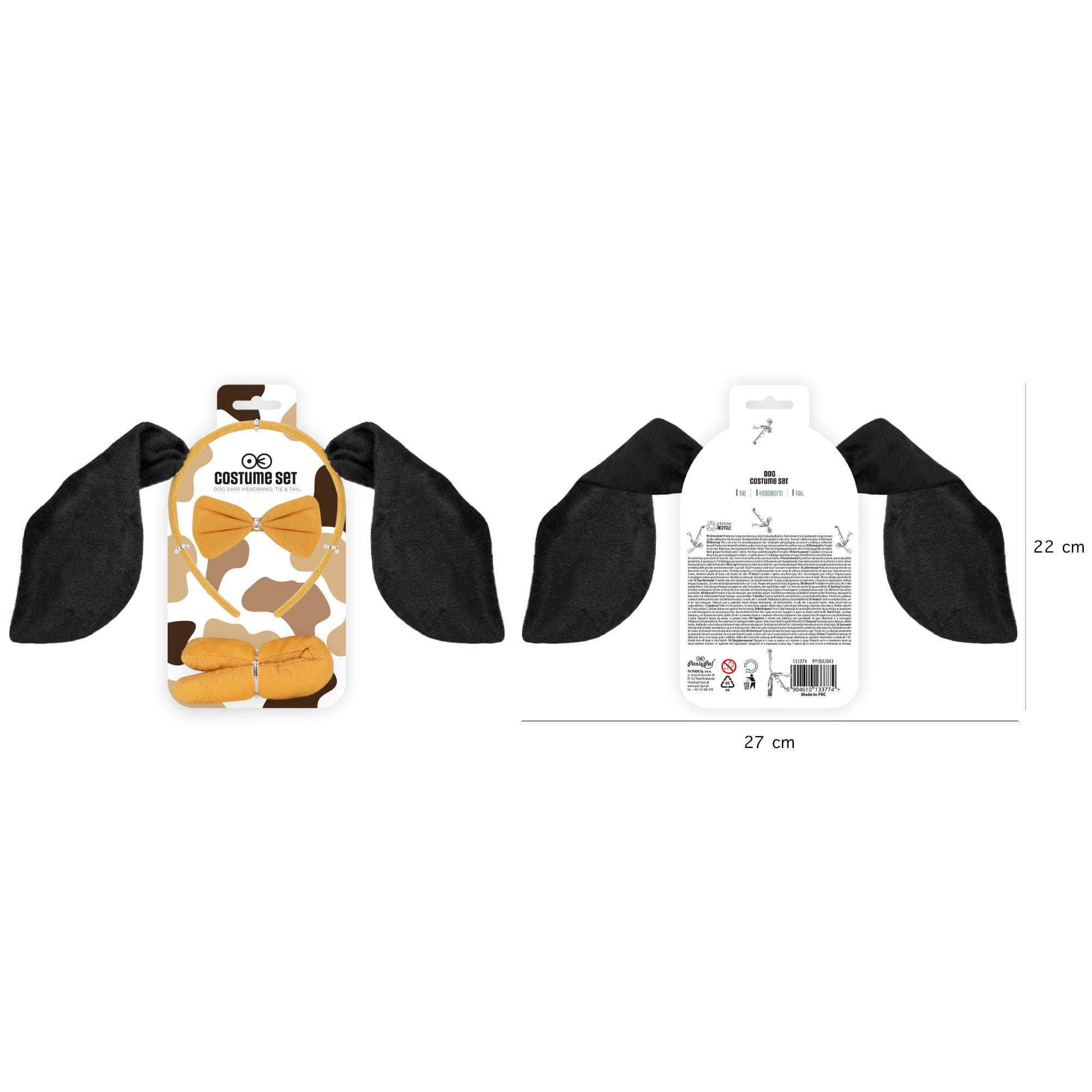 W zestawie: opaska na głowę oraz ogon i muszka mocowane przy pomocy gumki.