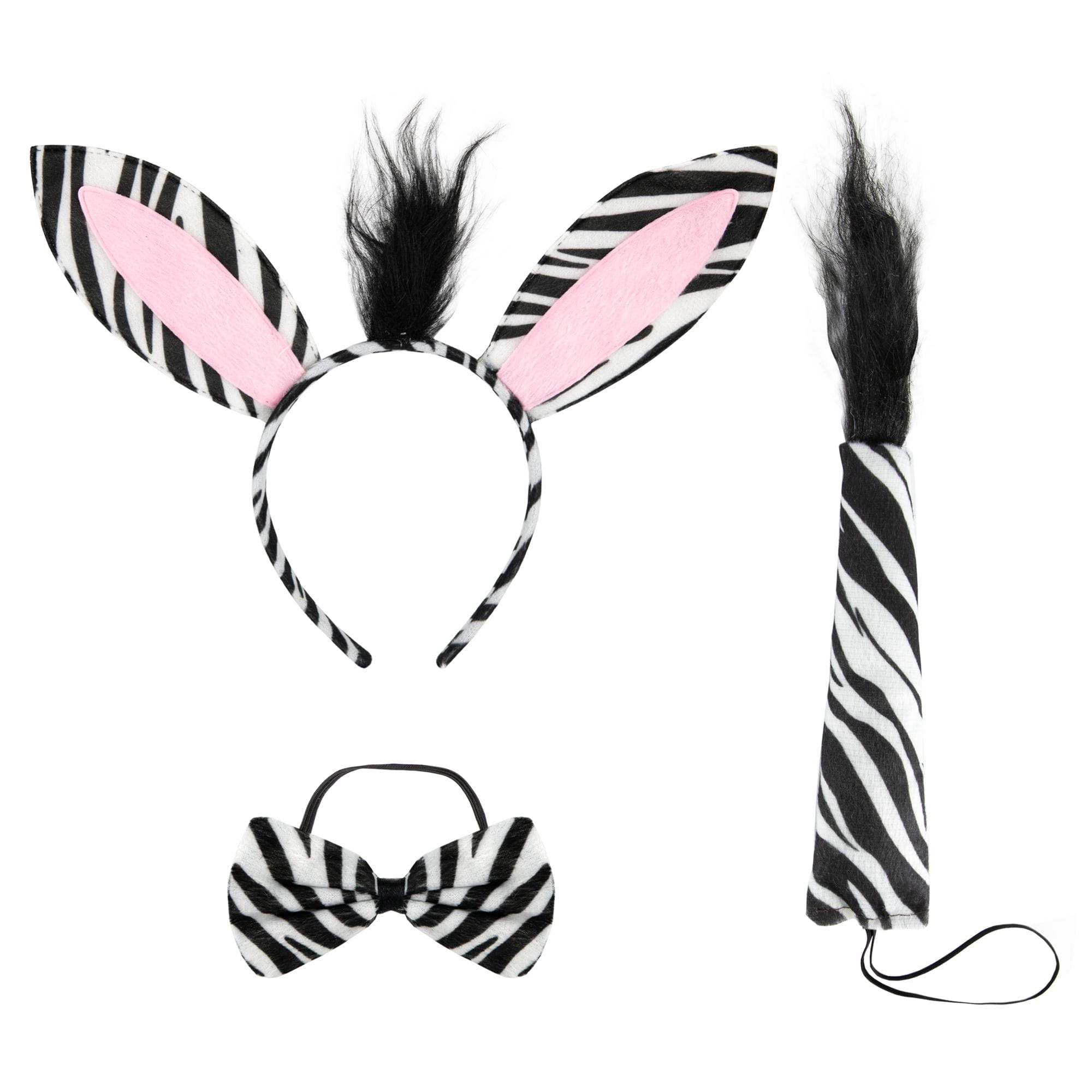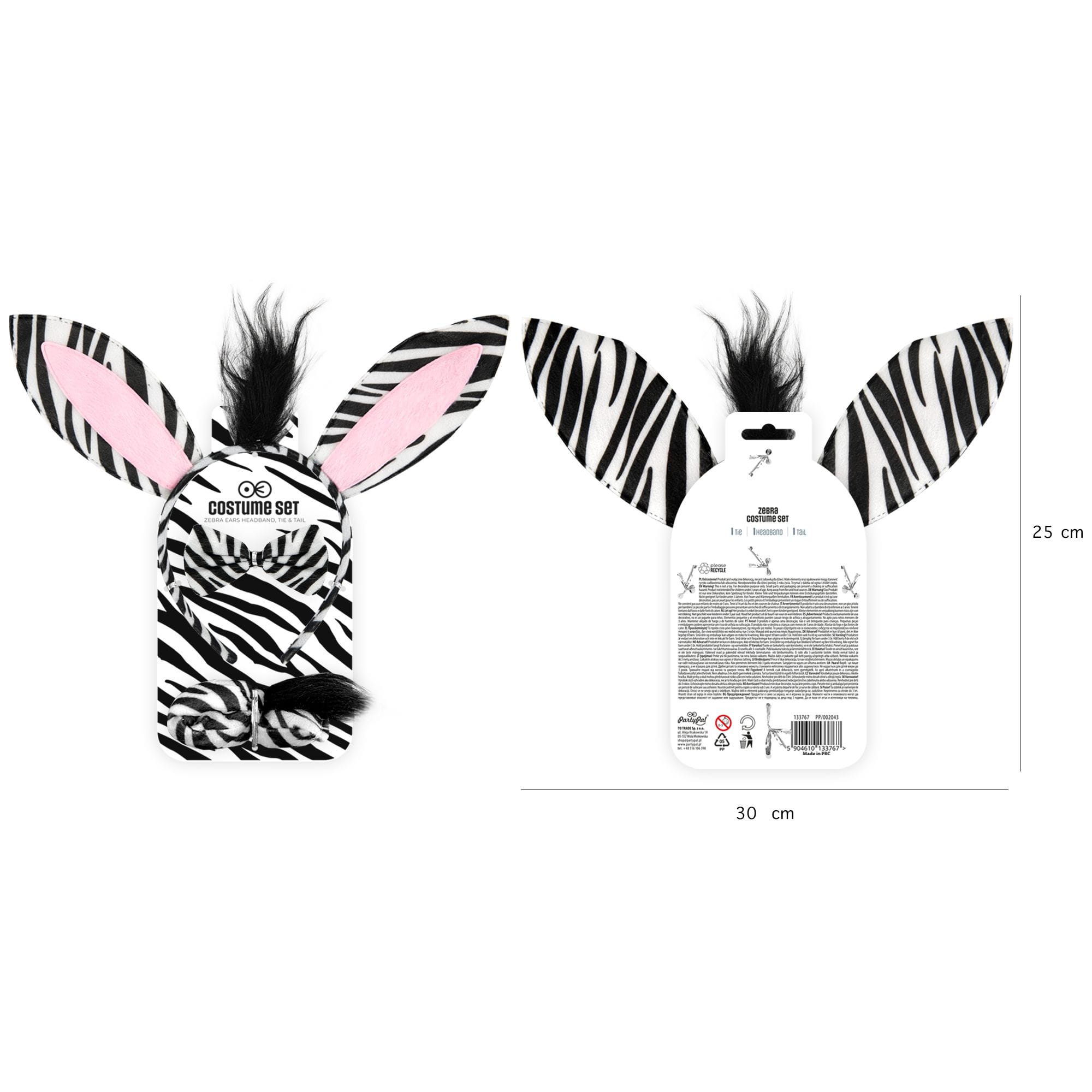 W zestawie: opaska na głowę oraz ogon i muszka mocowane przy pomocy gumki.