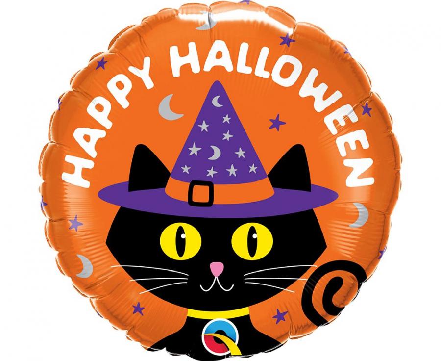 Balon foliowy Happy Halloween kot w kapeluszu okrągły 18 cali