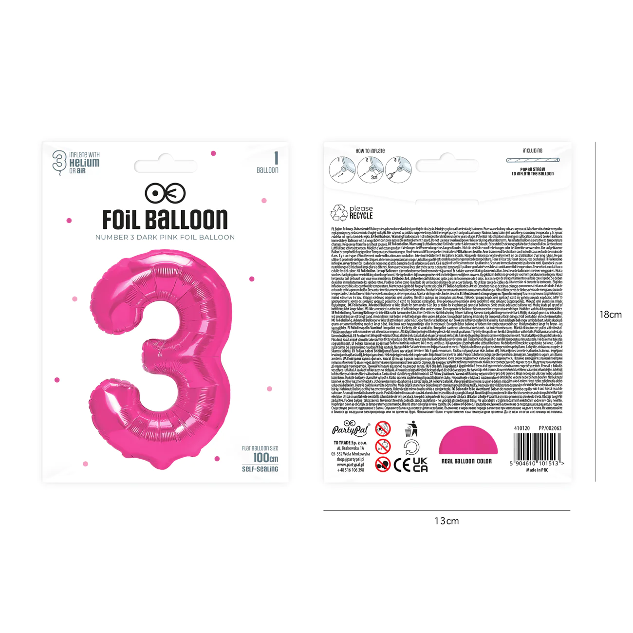 Balon foliowy cyfra 3 ciemnoróżowy 85 cm