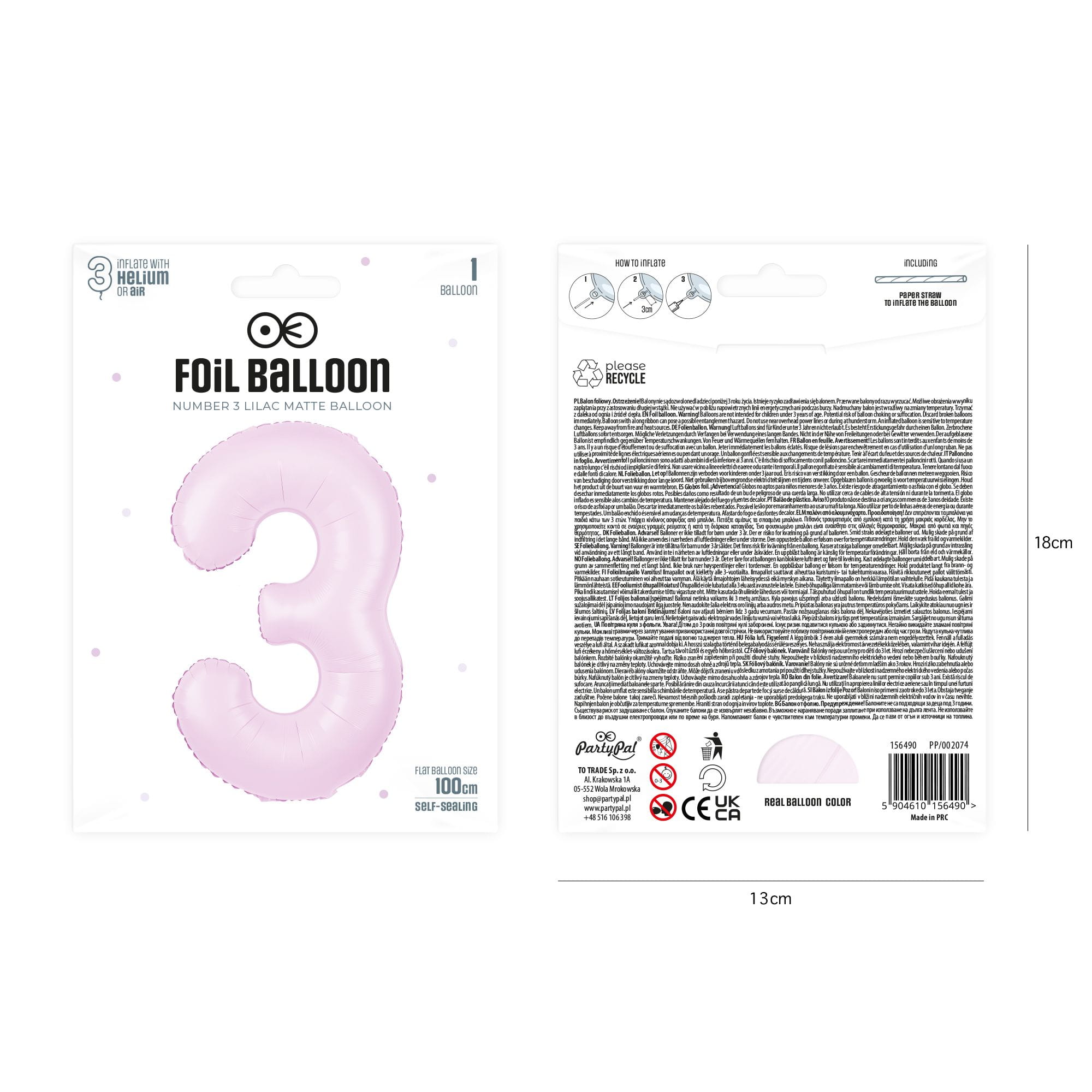 Balon foliowy cyfra 3 liliowy matowy 85 cm