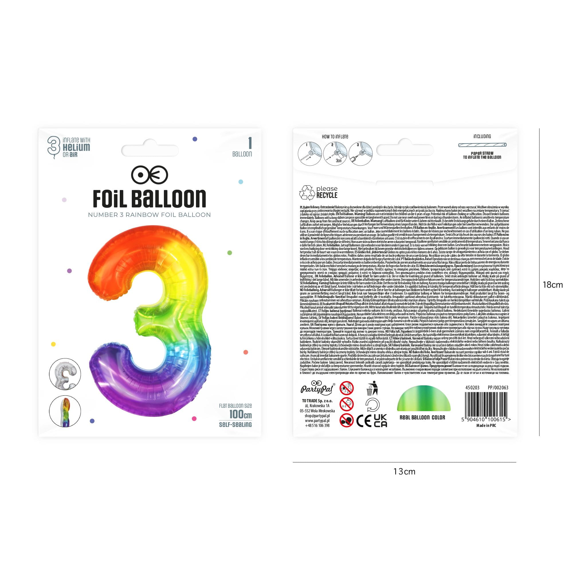 Balon foliowy cyfra 3 tęczowy 85 cm