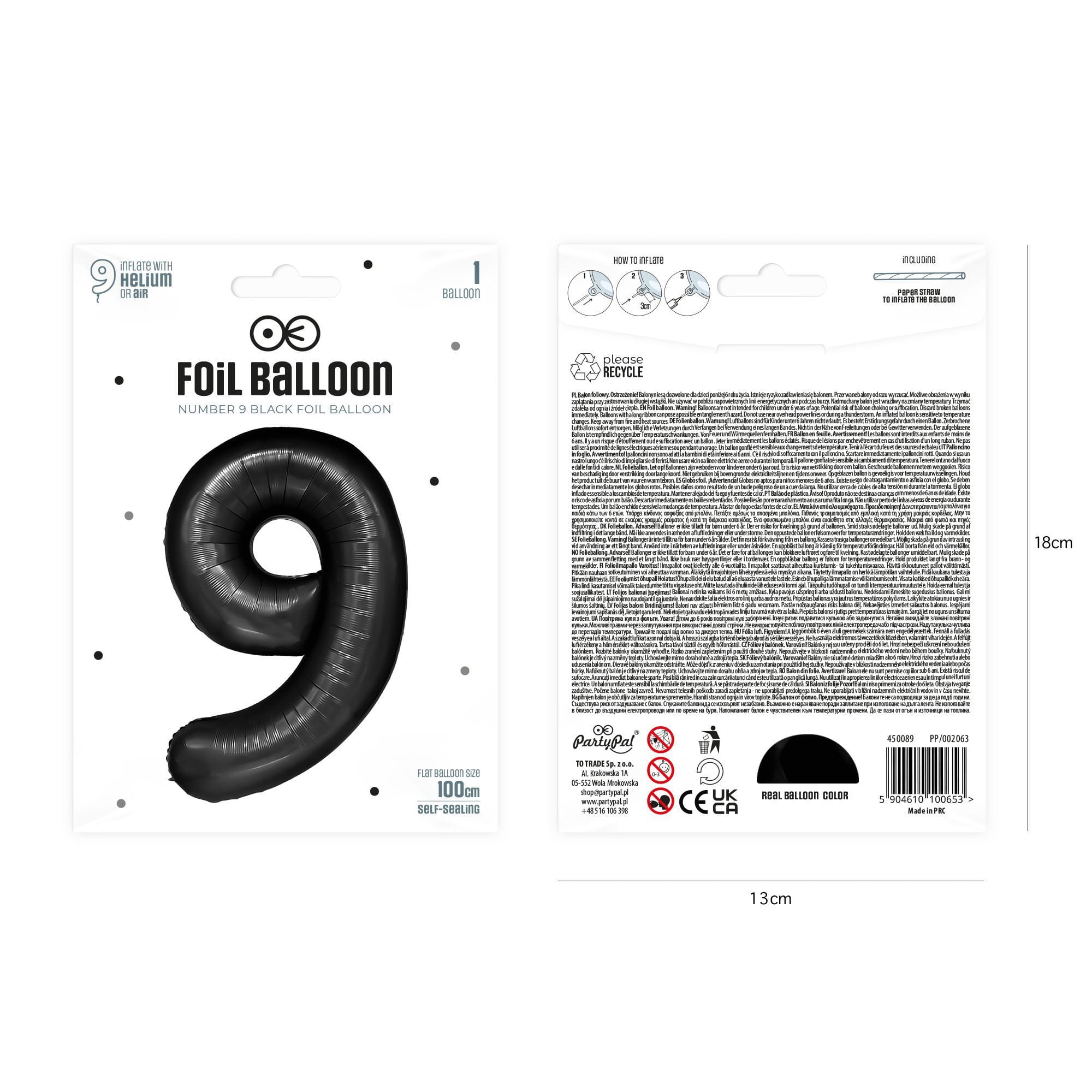 Balon foliowy cyfra 9 czarny 85 cm