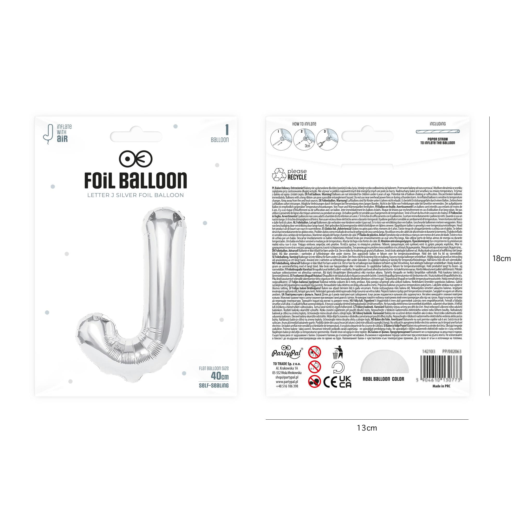 Balon foliowy litera J srebrny 40 cm