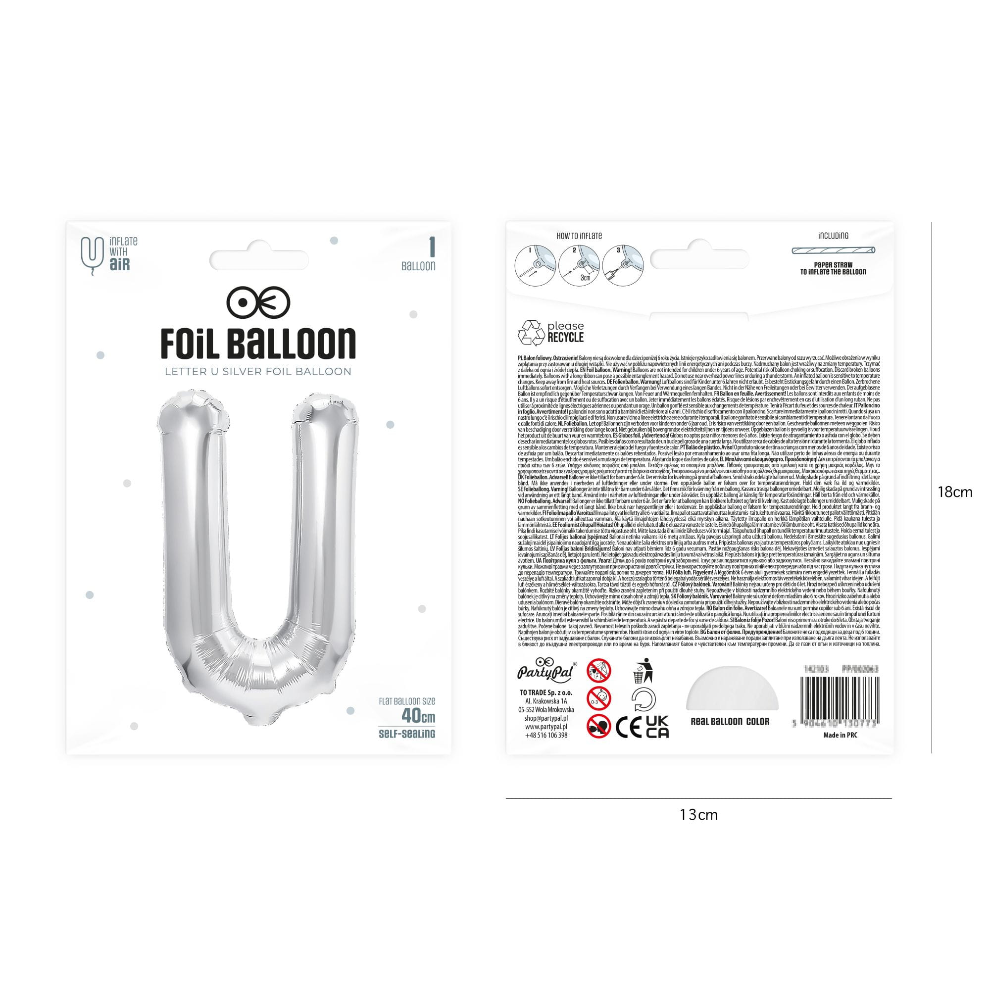 Balon foliowy litera U srebrny 40 cm