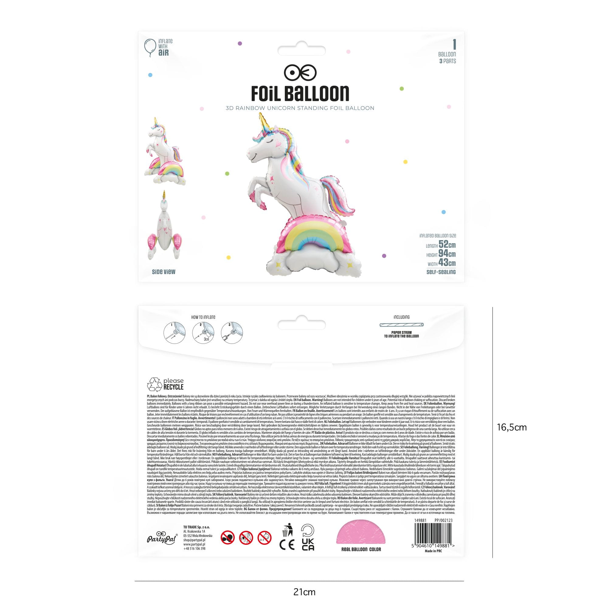Balon foliowy stojący Jednorożec i tęcza 94 cm