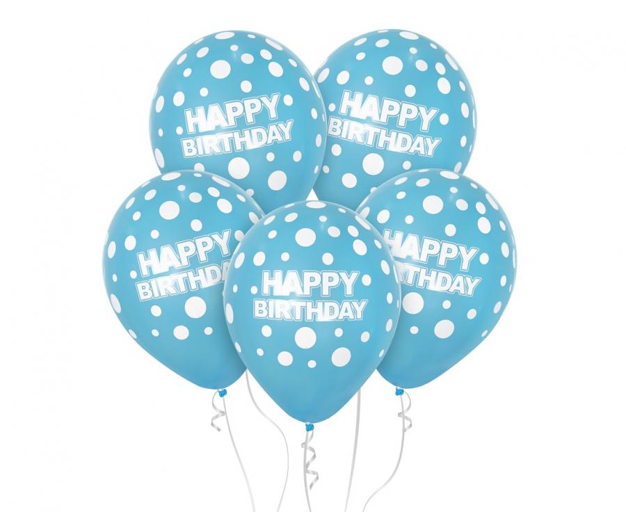 Balony Happy Birthday niebieskie w białe grochy 12 cali 5 szt