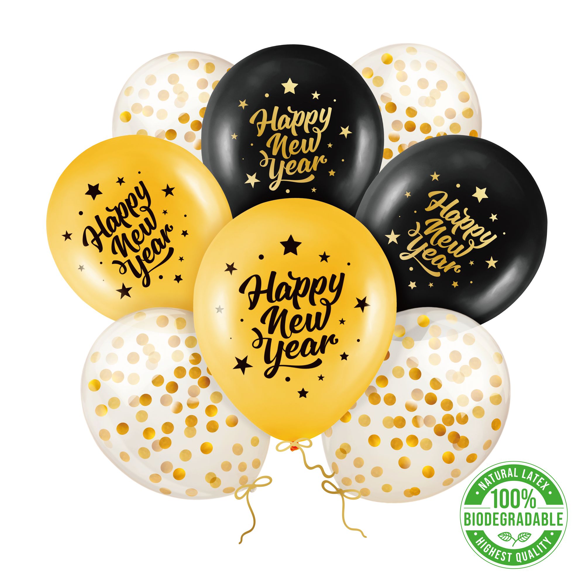 - Zestaw zawiera 2 balony w odcieniu złota z czarnym napisem Happy New Year, 2 czarne balony ze złotym napisem Happy New Year, 4 balony transparentne ze złotym konfetti