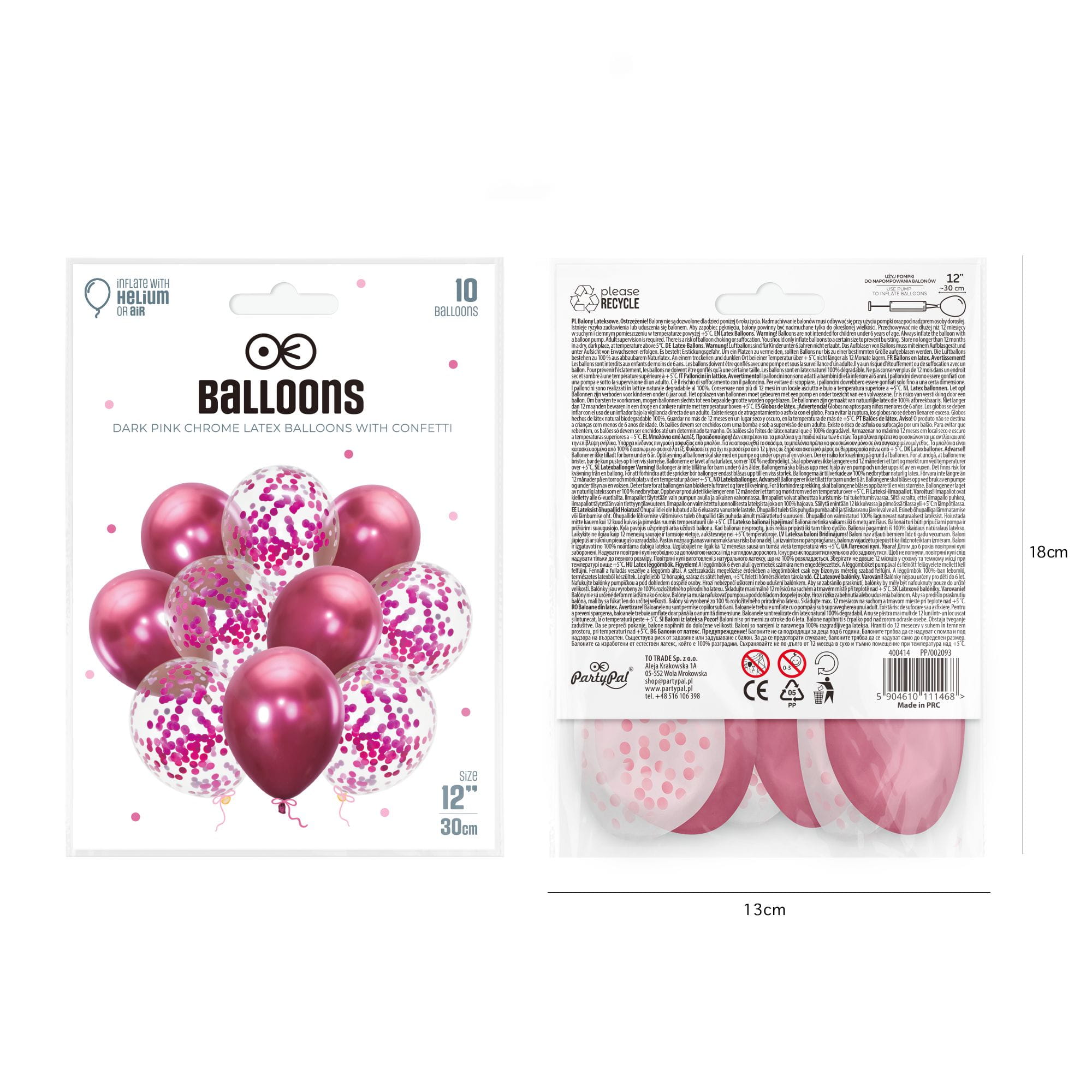 Balony ciemny róż chrom z konfetti 27 cm 12 cali 10 szt