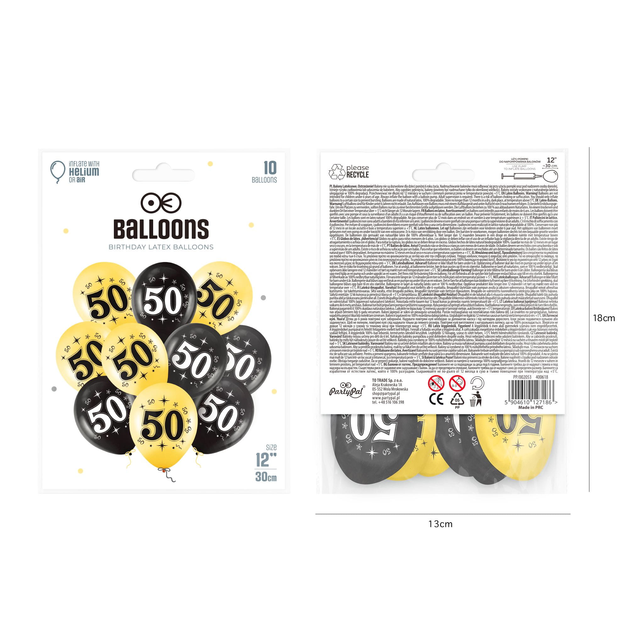 - W zestawie 5 balonów złotych i 5 czarnych z liczbą 50