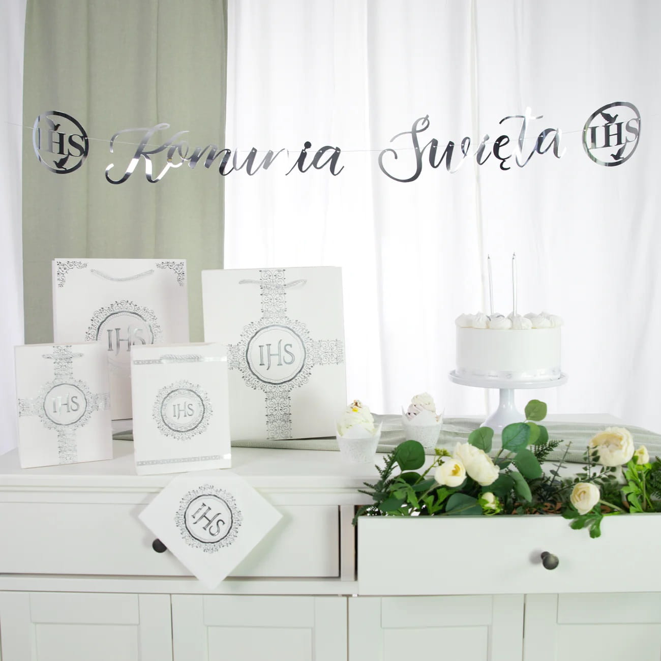 Baner Komunia Święta IHS wykonany ze srebrnego papieru.