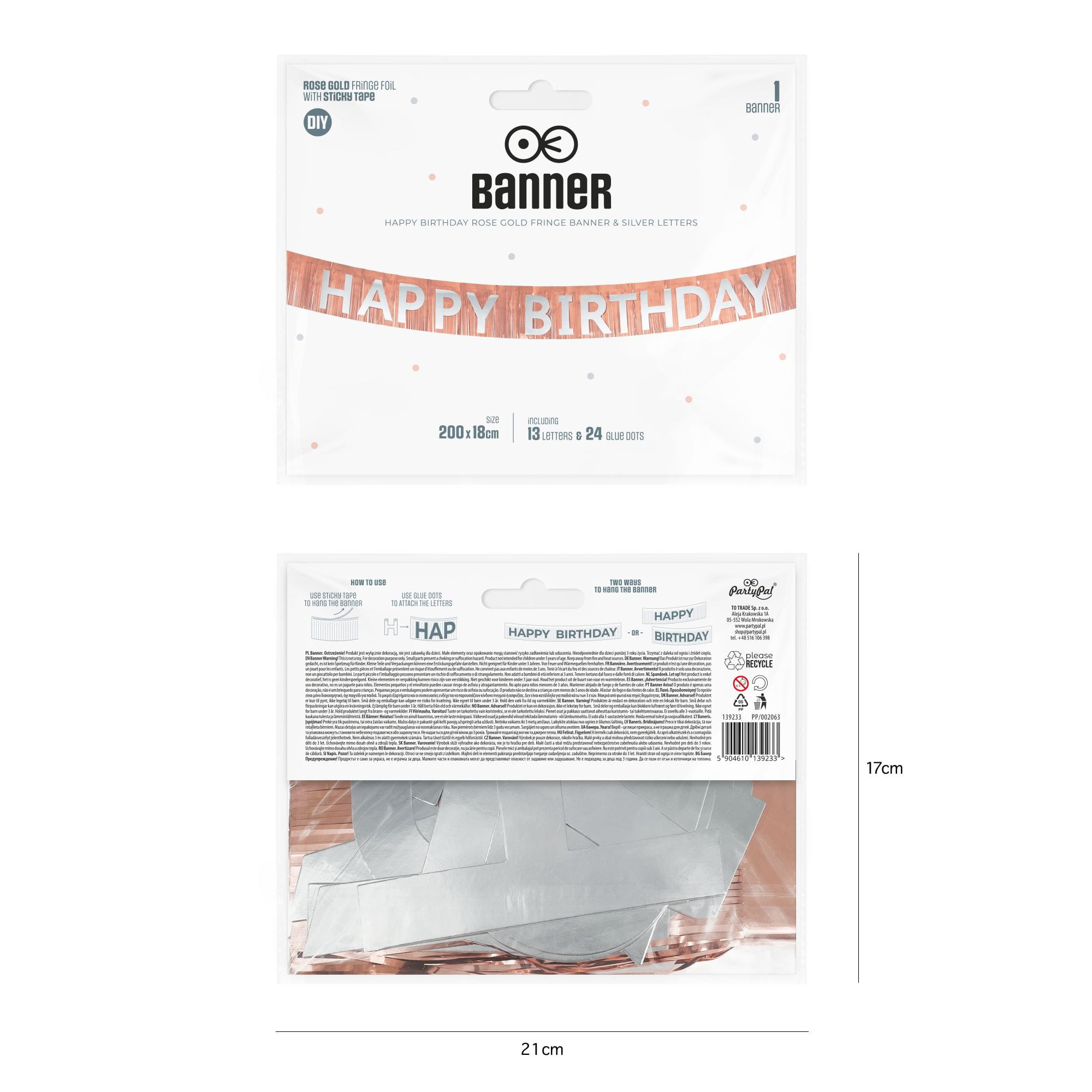 - W komplecie: 2 girlandy z metalicznymi frędzlami, 13 liter, 24 kropki klejowe