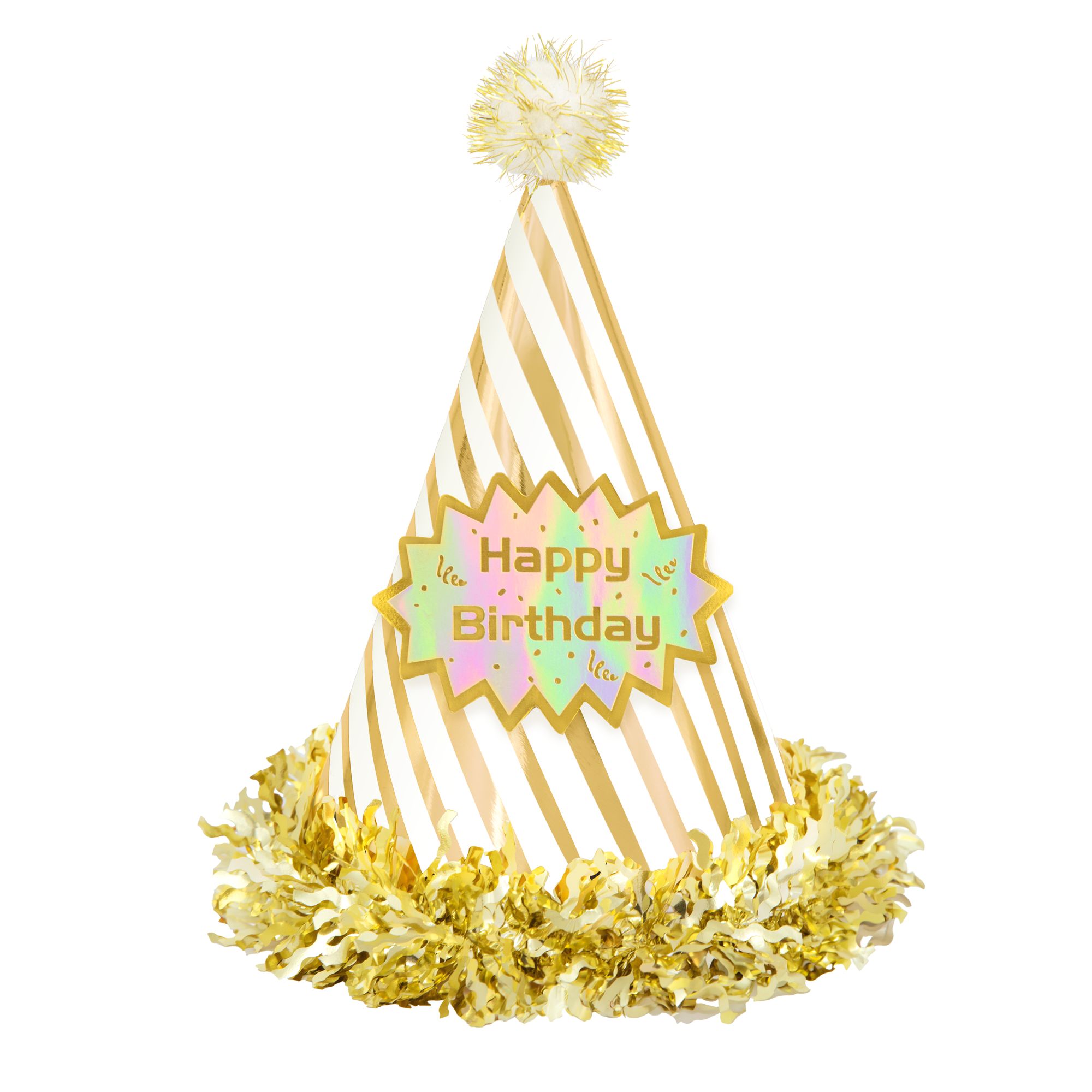 Czapeczka urodzinowa z pomponem Happy Birthday w paski biało-złota 1 szt
