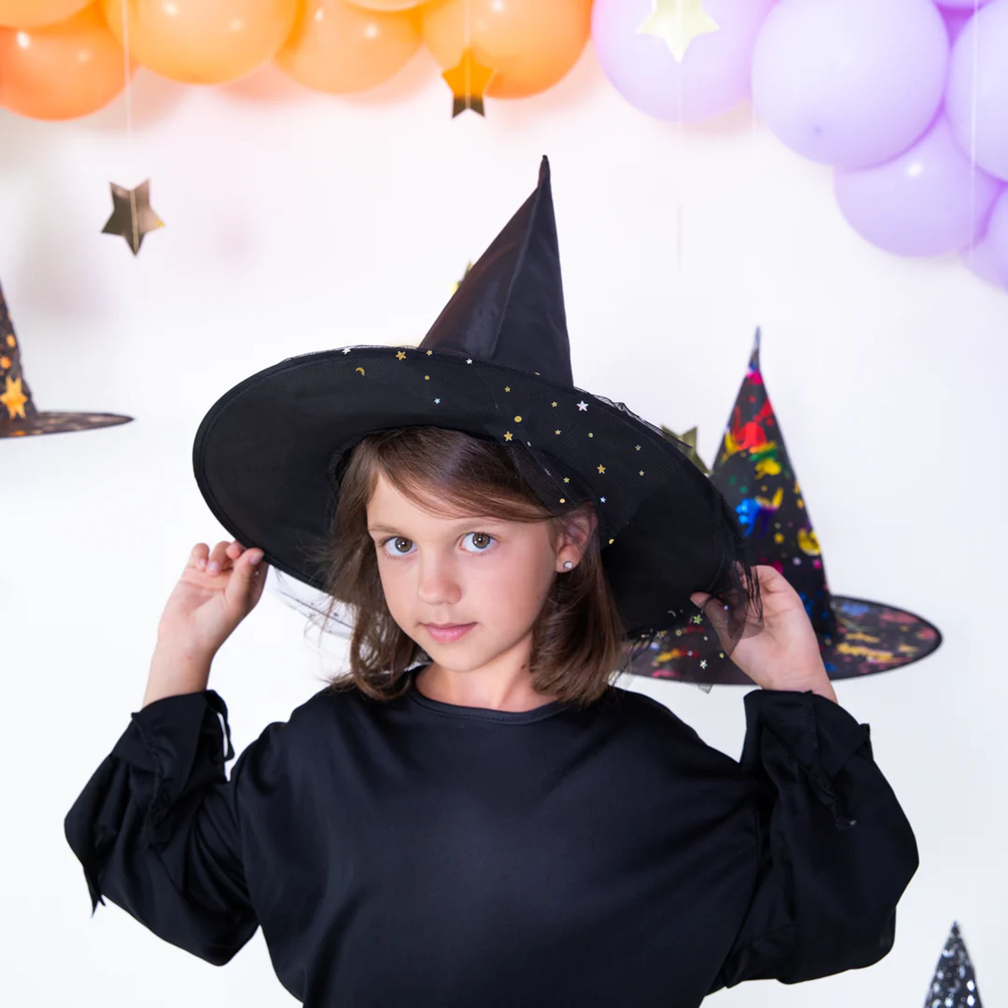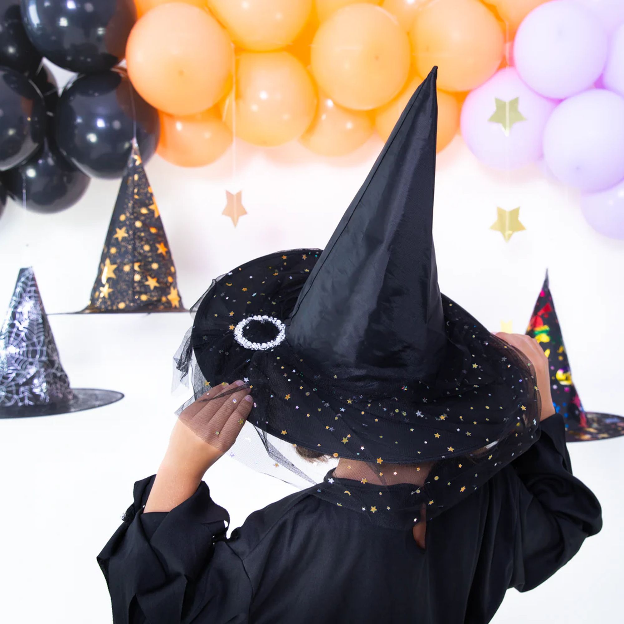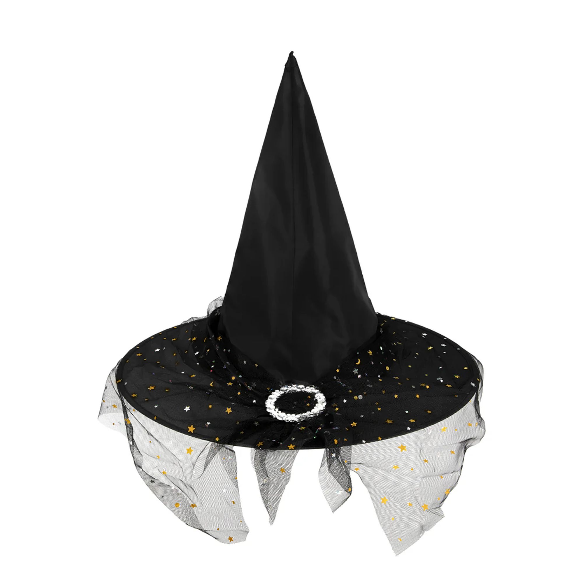 Kapelusz czarownicy z tiulem czarno-srebrny
