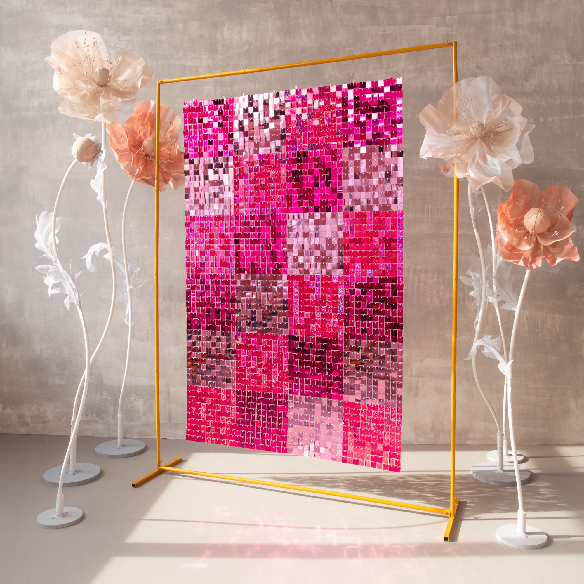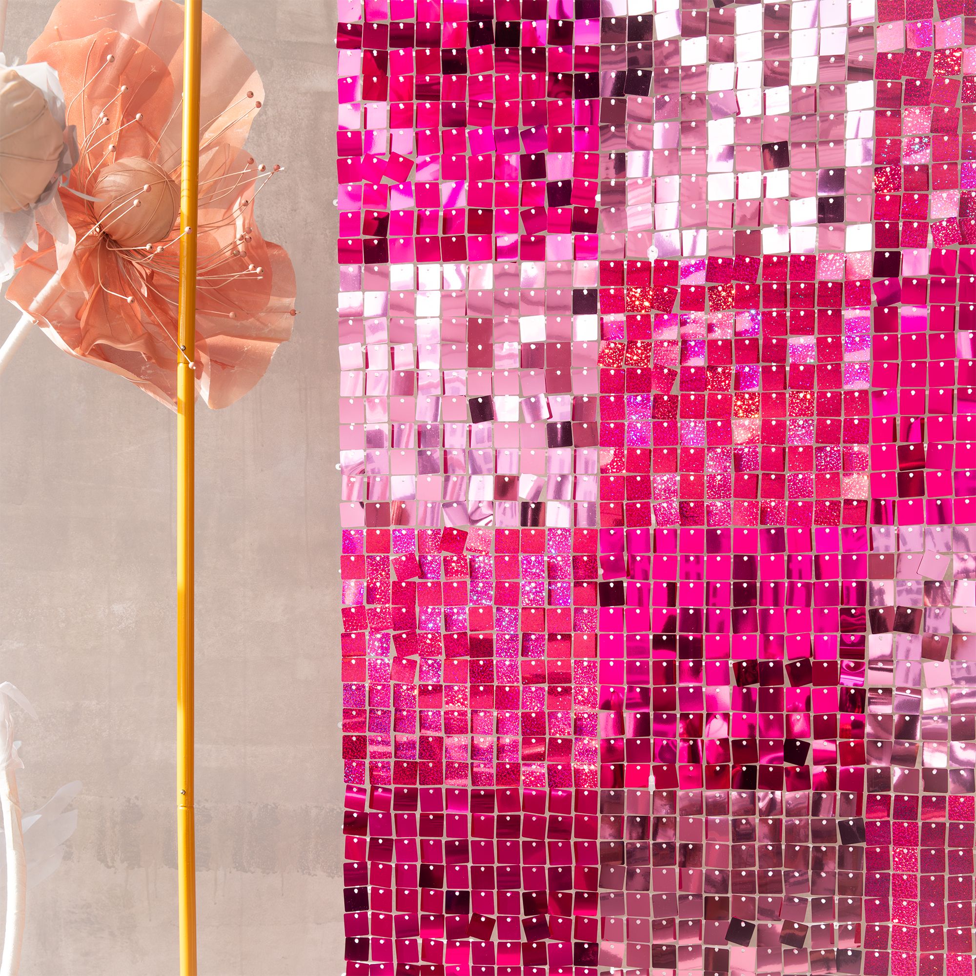 Seria paneli dekoracyjnych, dzięki którym można stworzyć atrakcyjne tło do sesji zdjęciowej lub na wystrzałową imprezę. Każdy panel składa się ze 100 pojedynczych, luźno zawieszonych blaszek, które dają niezwykle ciekawy, trójwymiarowy efekt poruszając się na skutek ruchu powietrza. Cekinowa struktura i połysk sprawiają, że efektownie odbijają światło. Idealne na wesele, urodziny, Sylwester czy zabawę karnawałową.