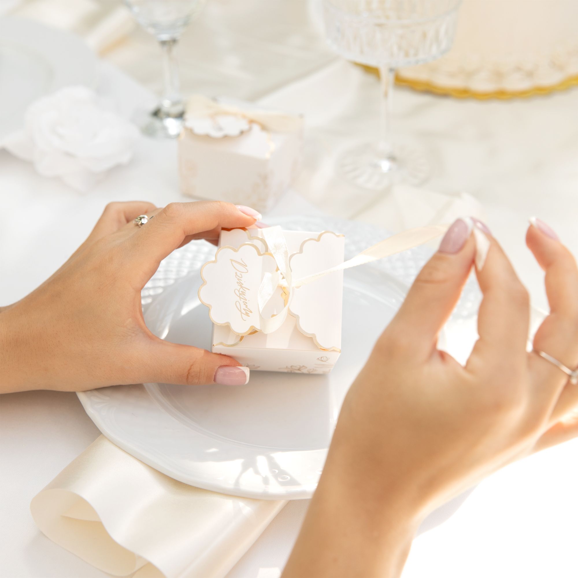 - W zestawie: 10 pudełeczek, 10 etykiet, 10 wstążek o długości 39 cm