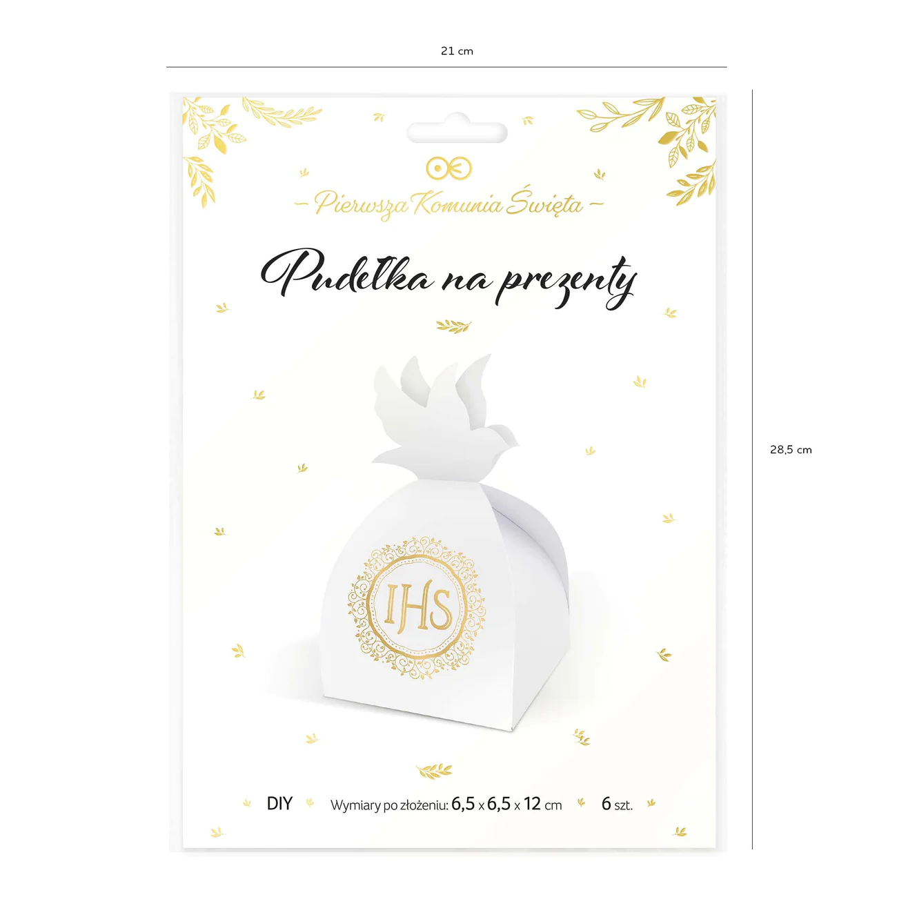 Pudełeczka dla gości na komunie, wykonane z białego papieru ze złotym nadrukiem IHS.