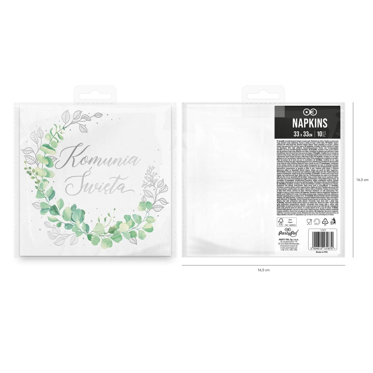 Białe serwetki komunijne ze srebrnym napisem Komunia Święta.