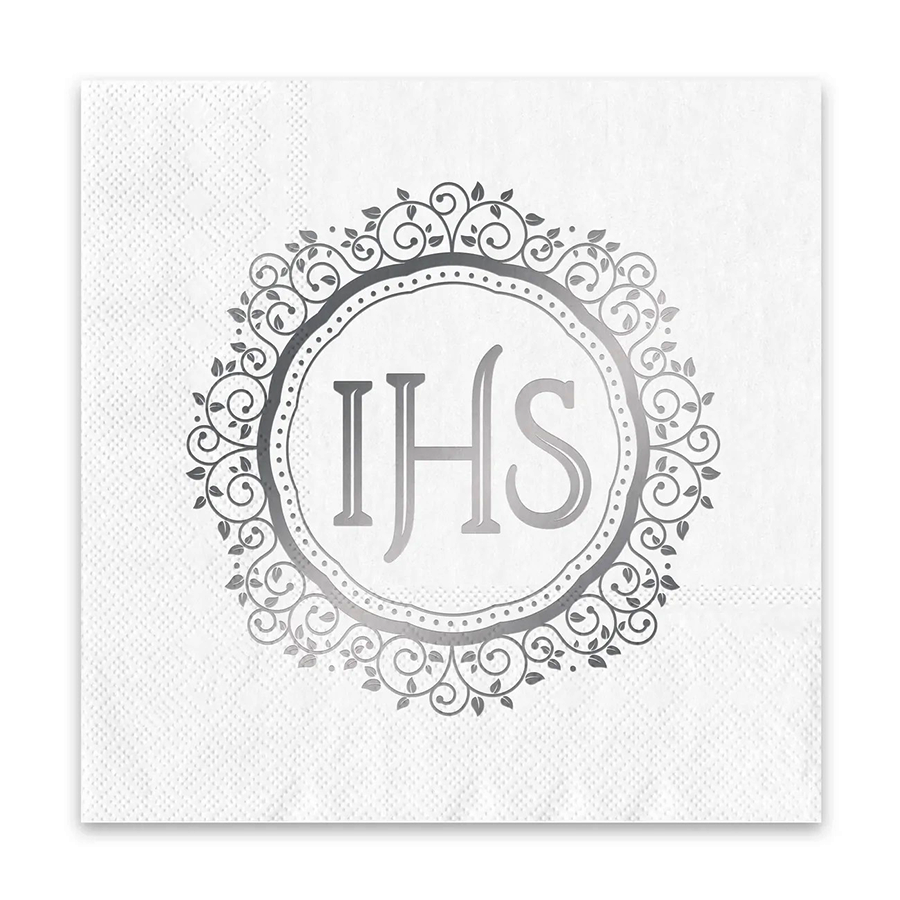 Białe serwetki komunijne ze srebrnym napisem IHS.