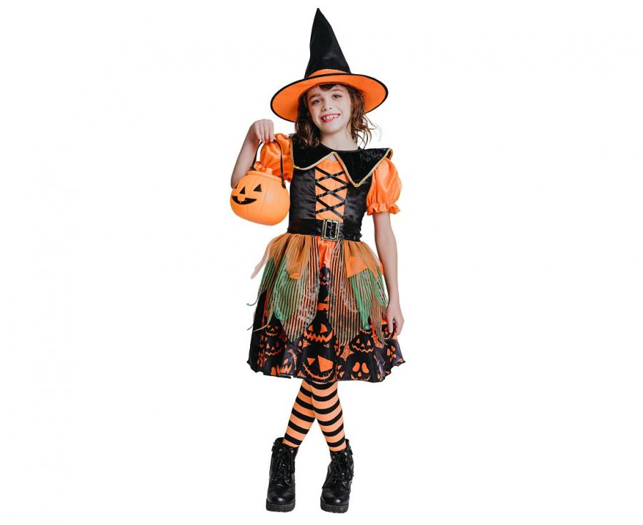 Strój dla dzieci Dyniowa Czarownica (sukienka kapelusz pasek kołnierz) rozm. 130/140 cm