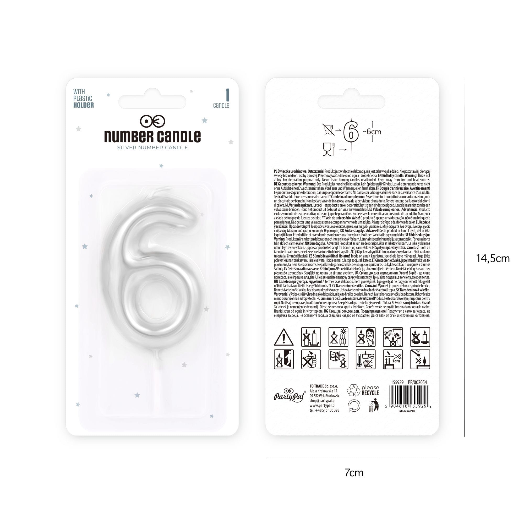 Świeczka cyfra 6 srebrna połysk