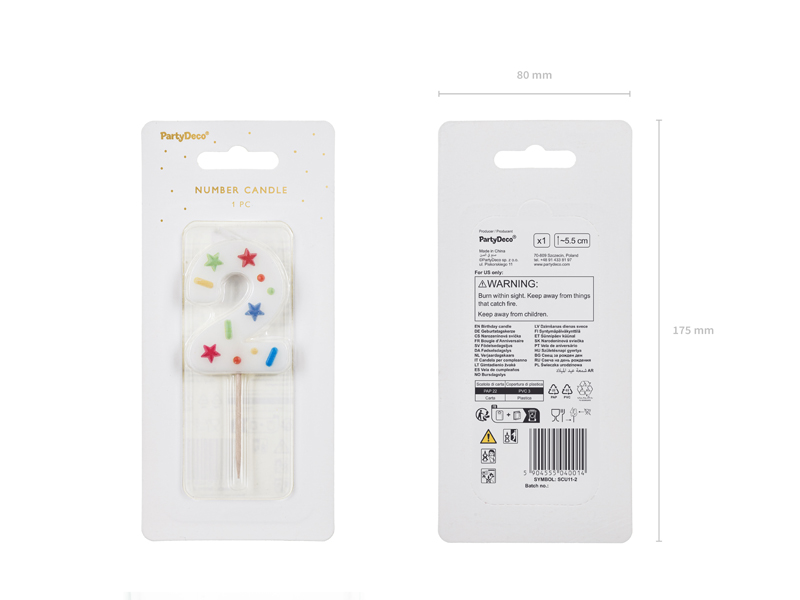 Świeczka urodzinowa Cyfra 2 biała konfetti 5.5 cm