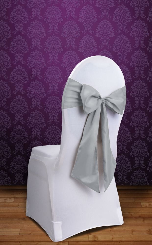 Szarfa na krzesło z grubej matowej satyny w kolorze srebrnym.