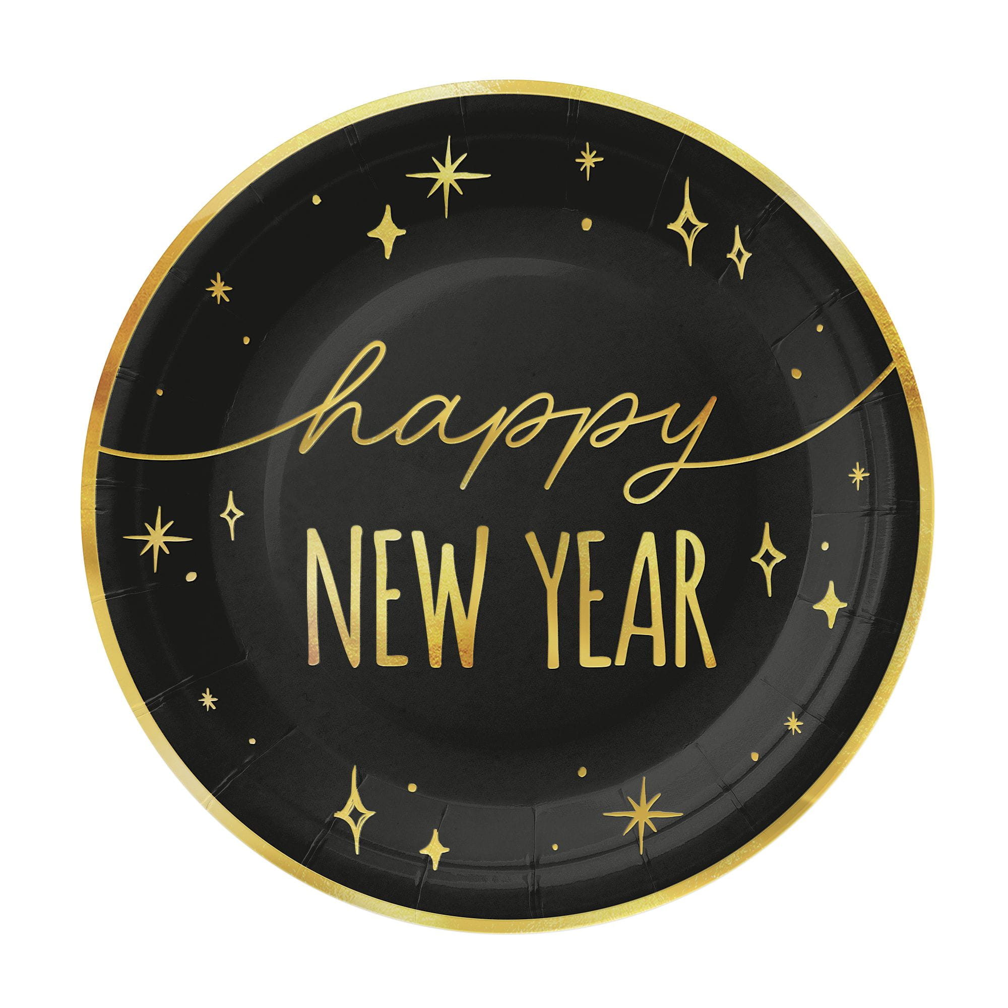 Talerzyki papierowe Happy New Year czarno-złote 18 cm 6 szt
