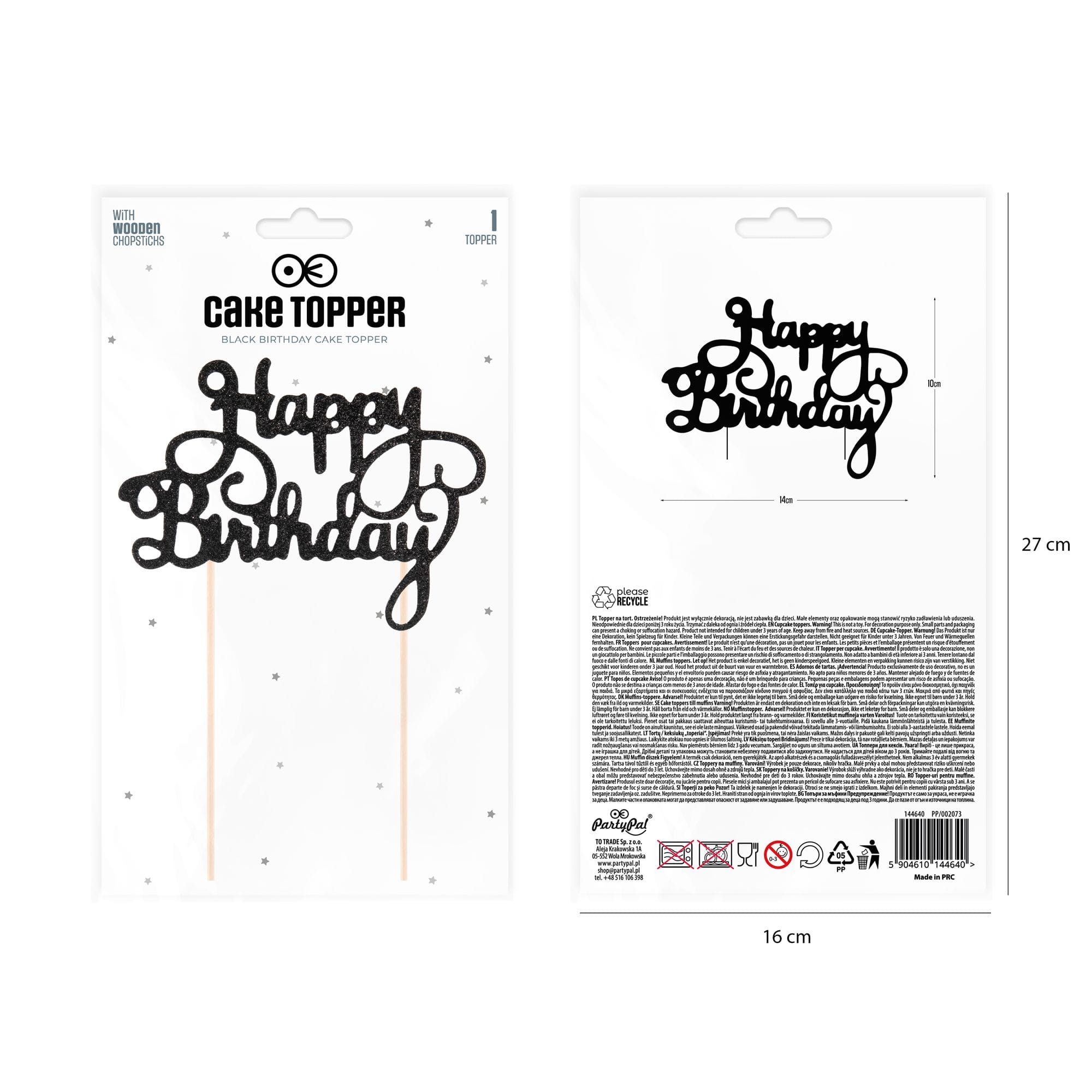 Topper na tort Happy Birthday brokatowy czarny 1 szt