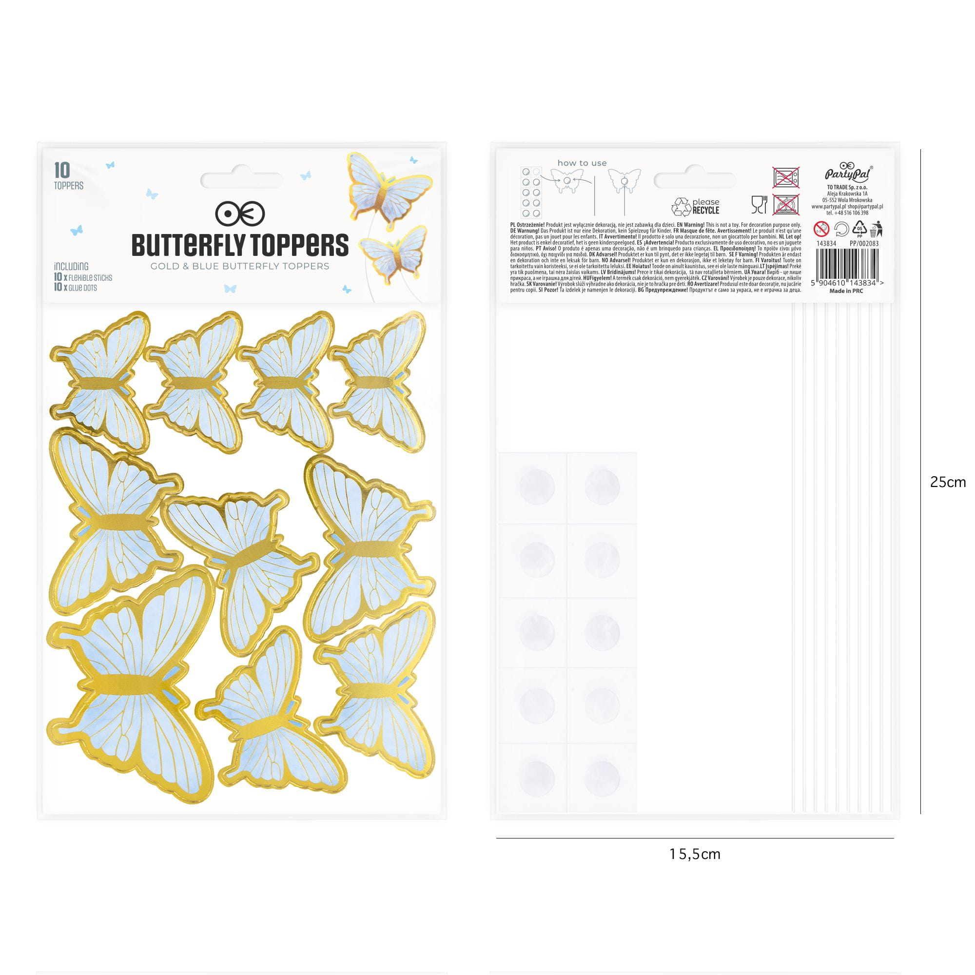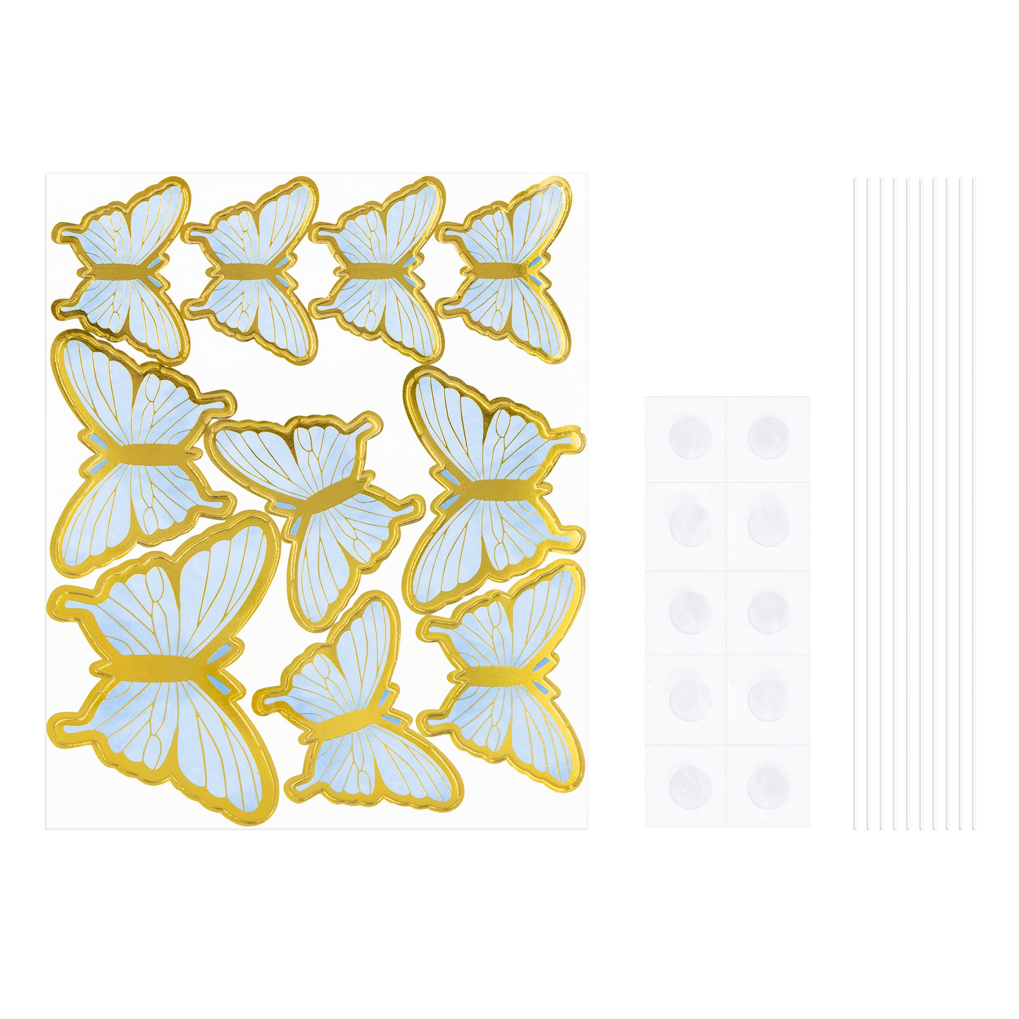 - W zestawie: 10 szt. papierowych motylków różnej wielkości, 10 szt. elastycznych pikerów, 10 szt. kropek klejowych