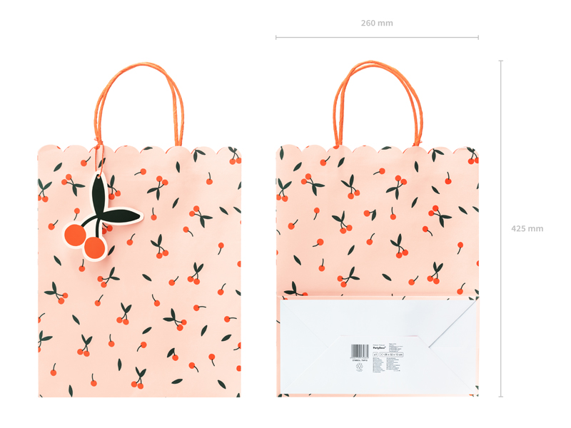 Torebka na prezenty w kolorze różowym z nadrukiem i zawieszką w kształcie wisienek oraz nadrukiem w kolorze koralowym w środku torebek, wymiary bez uchwytów ok. 26 x 32 x 13 cm.