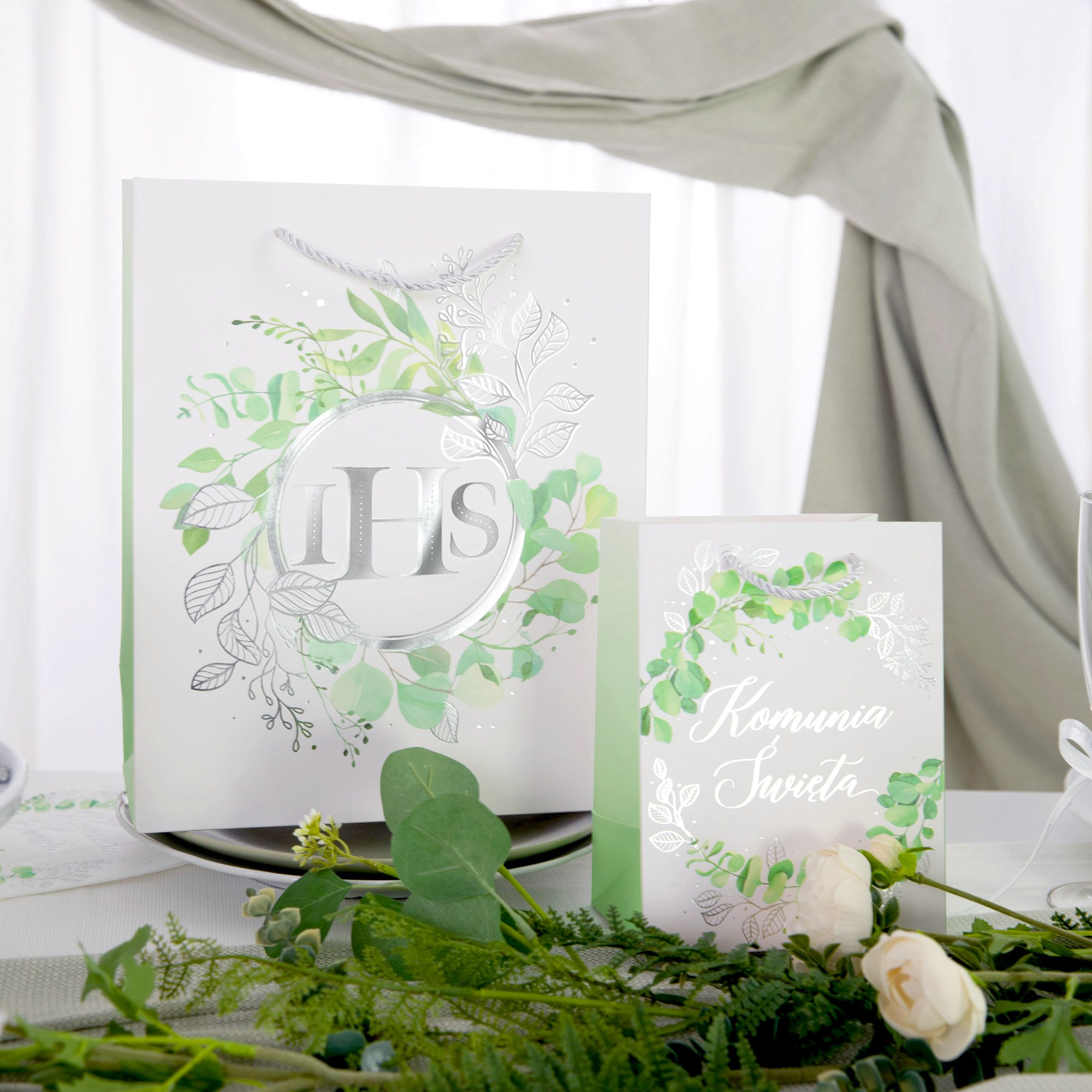 Torebka na prezenty komunijne IHS Eukaliptus srebrny duża 1 szt