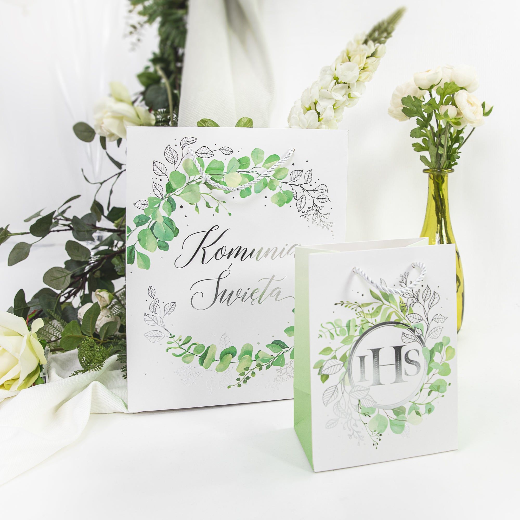 Torebka na prezenty komunijne IHS Eukaliptus srebrny mała 1 szt