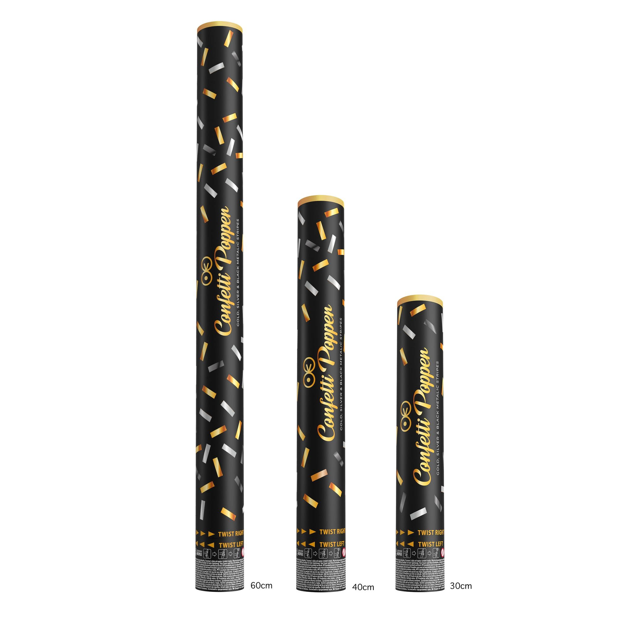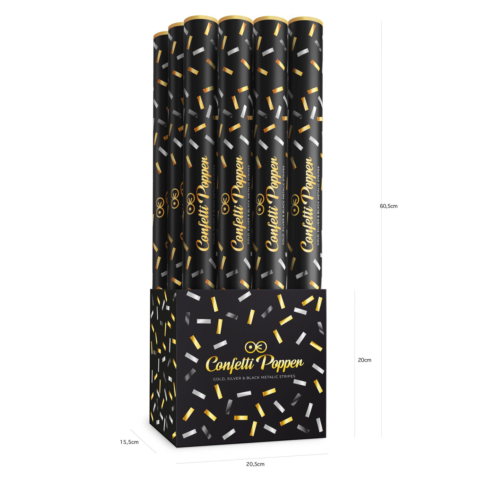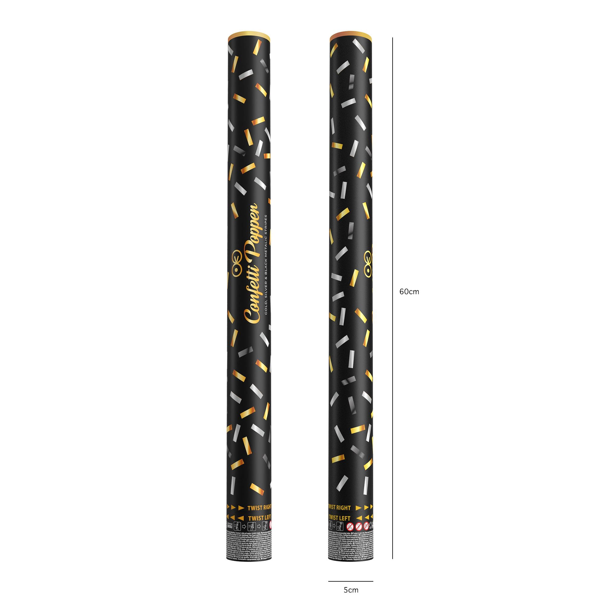 Tuba z konfetti paski metaliczne złote srebrne i czarne 60 cm
