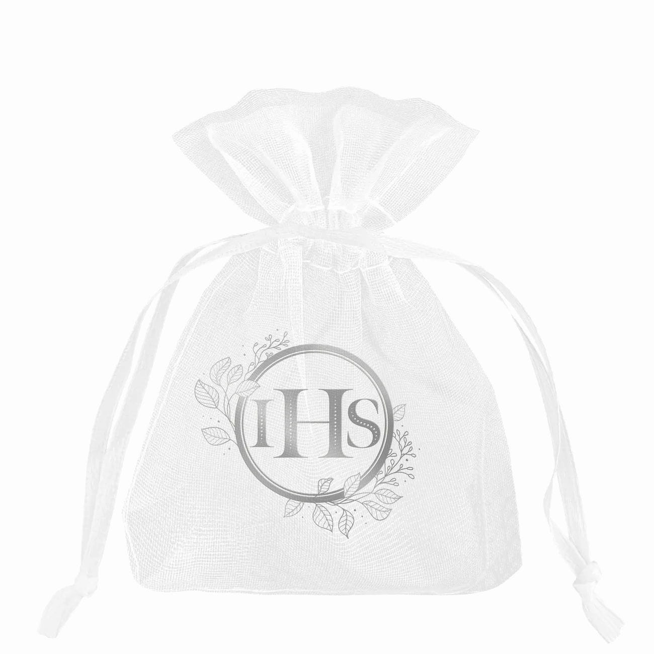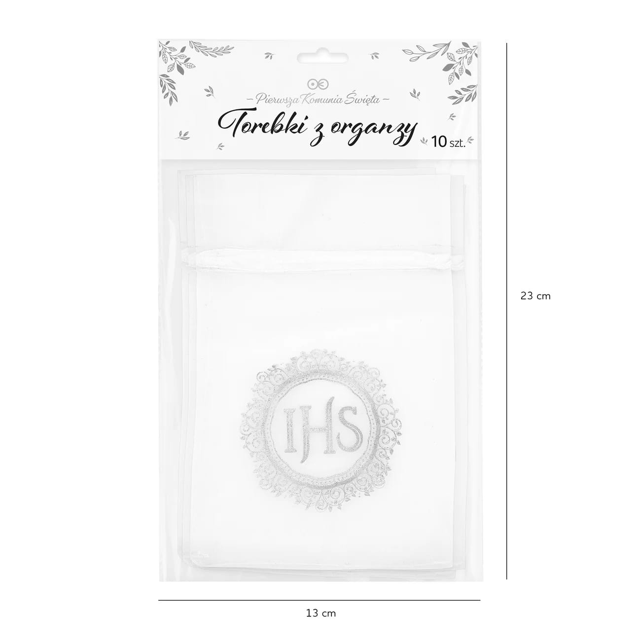 Woreczki z organzy na Komunie IHS biało-srebrne 10 cm x 15 cm 10 szt
