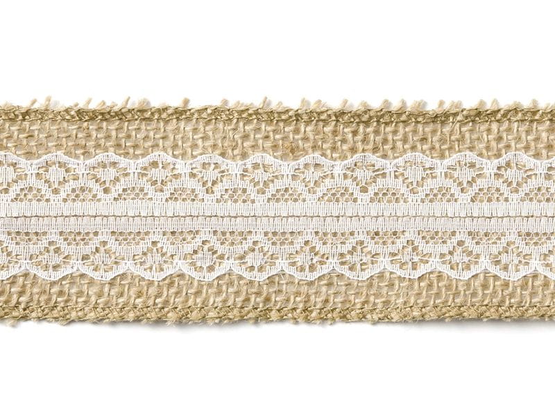 Taśma jutowa z białą koronką, szerokość ok. 5 cm, długość ok. 5 m.